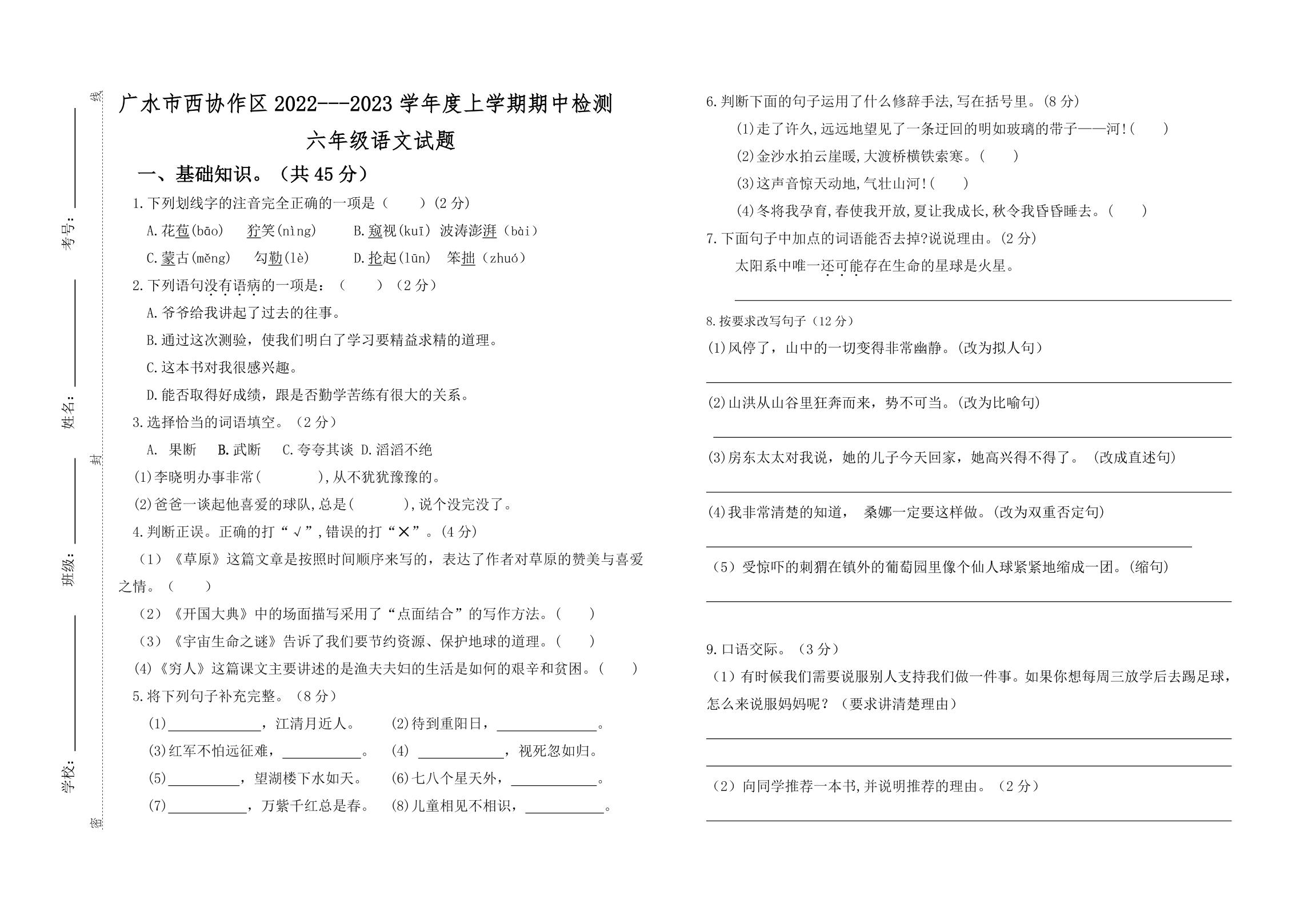 湖北省广水市2022-2023学年度上学期期中检测六年级语文(人教版)