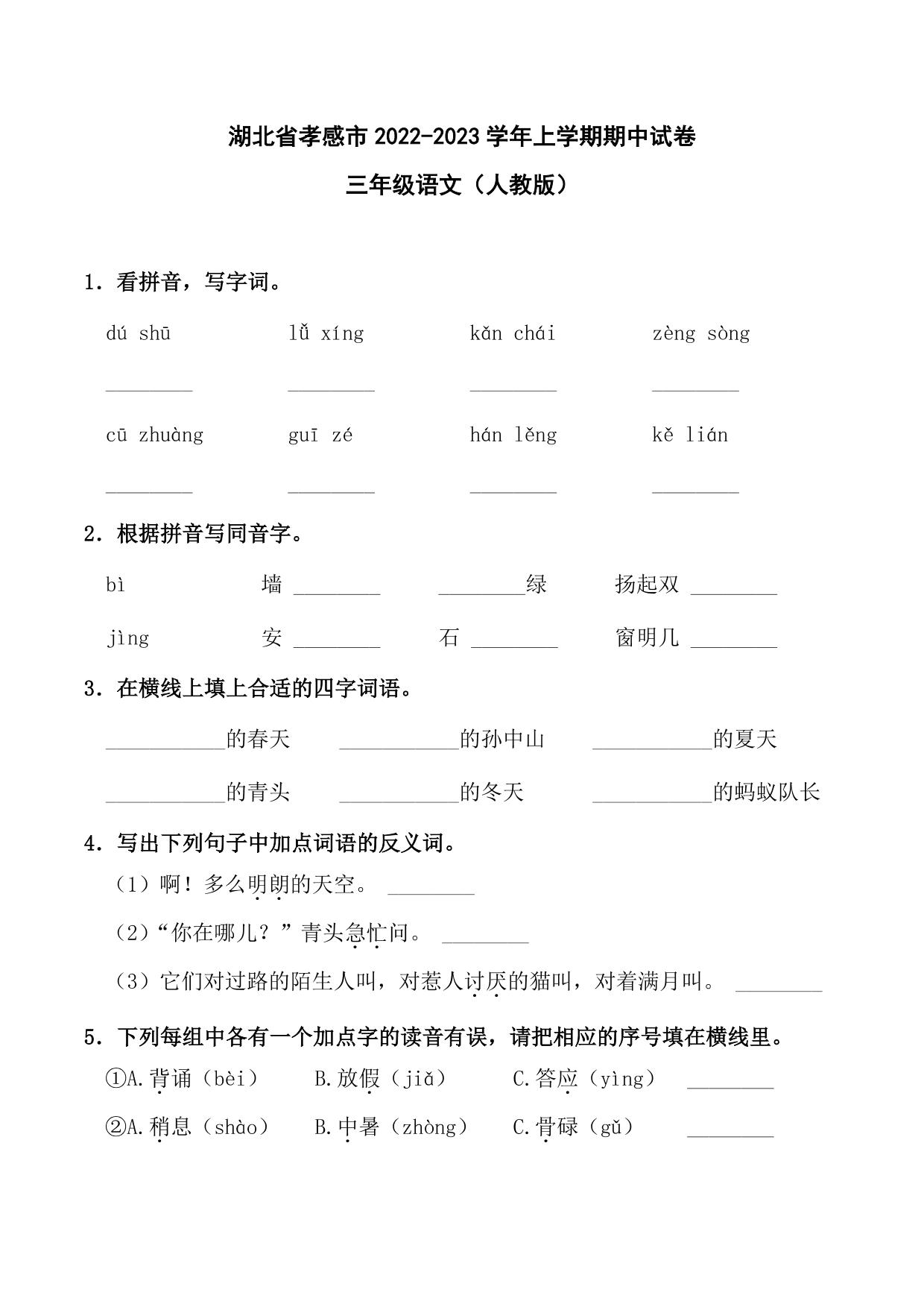 湖北省孝感市2022-2023学年上学期期中试卷三年级语文(人教版)