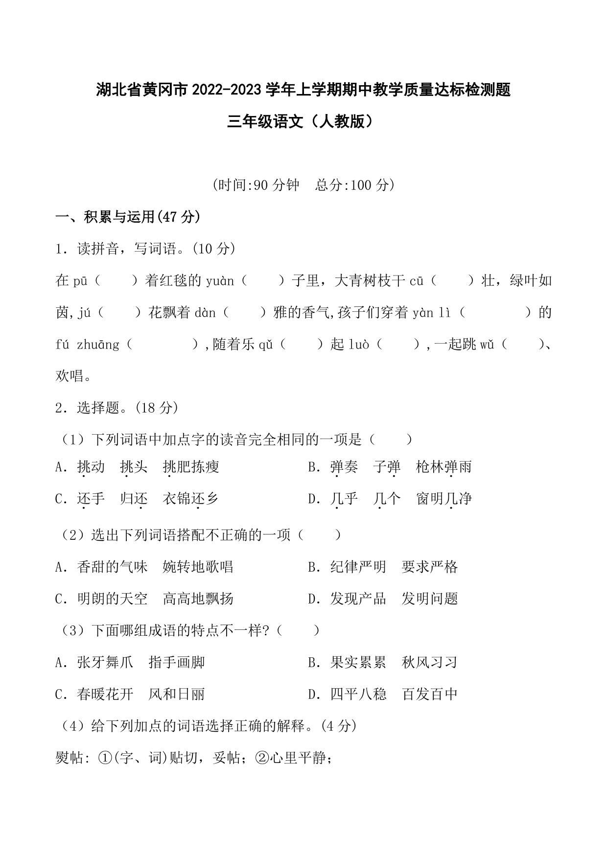 湖北省黄冈市2022-2023学年上学期期中教学质量达标检测题三年级语文(人教版)