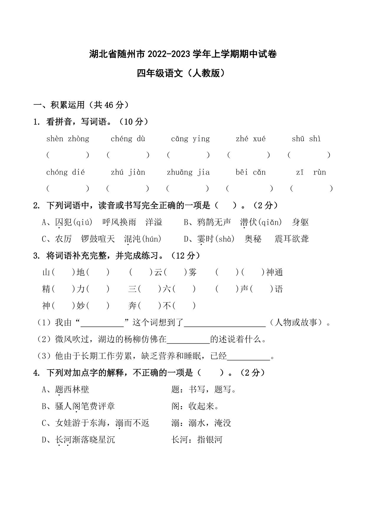 湖北省随州市2022-2023学年上学期期中试卷四年级语文(人教版)