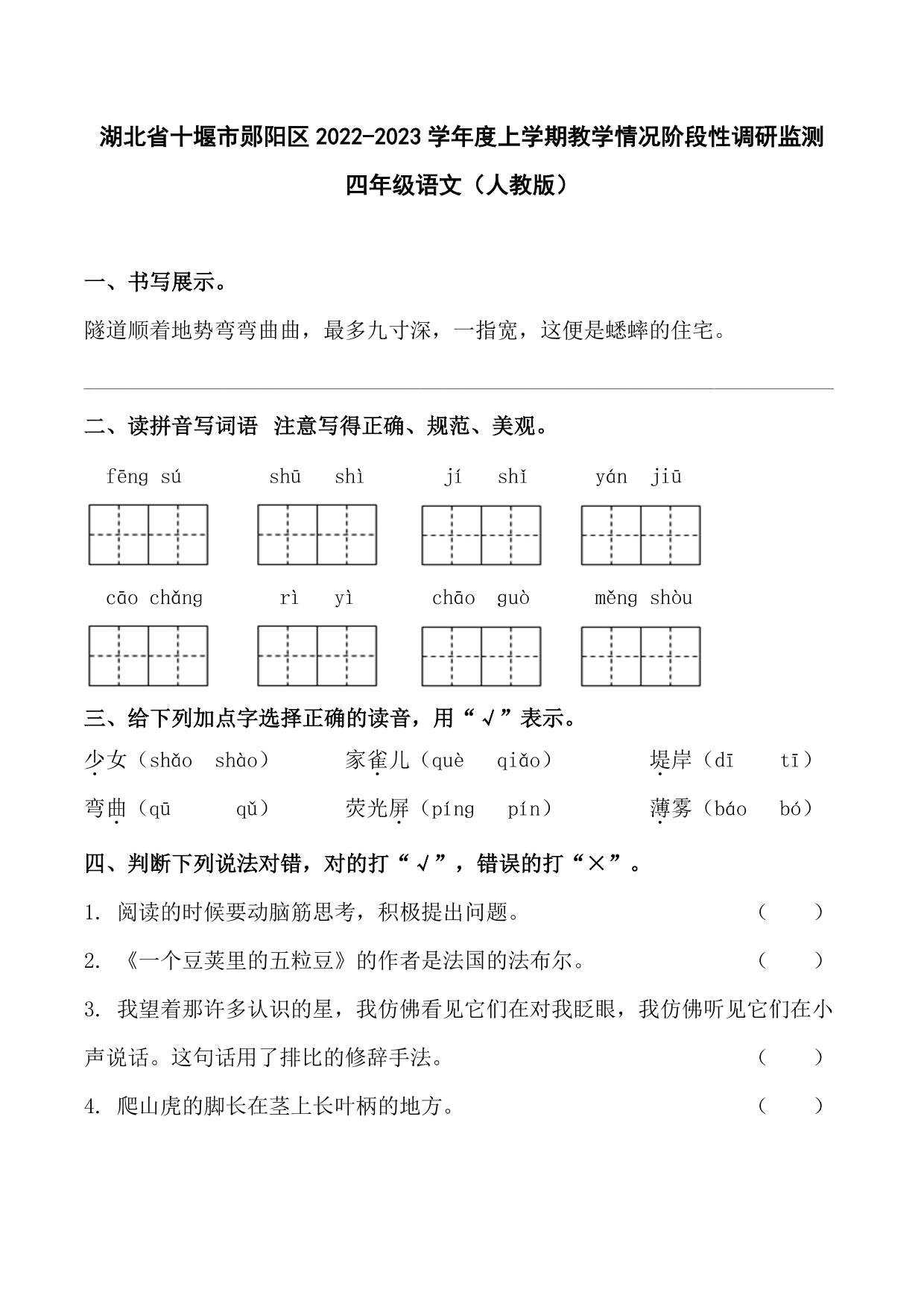 湖北省十堰市郧阳区2022-2023学年度上学期教学情况阶段性调研监测四年级语文(人教版)