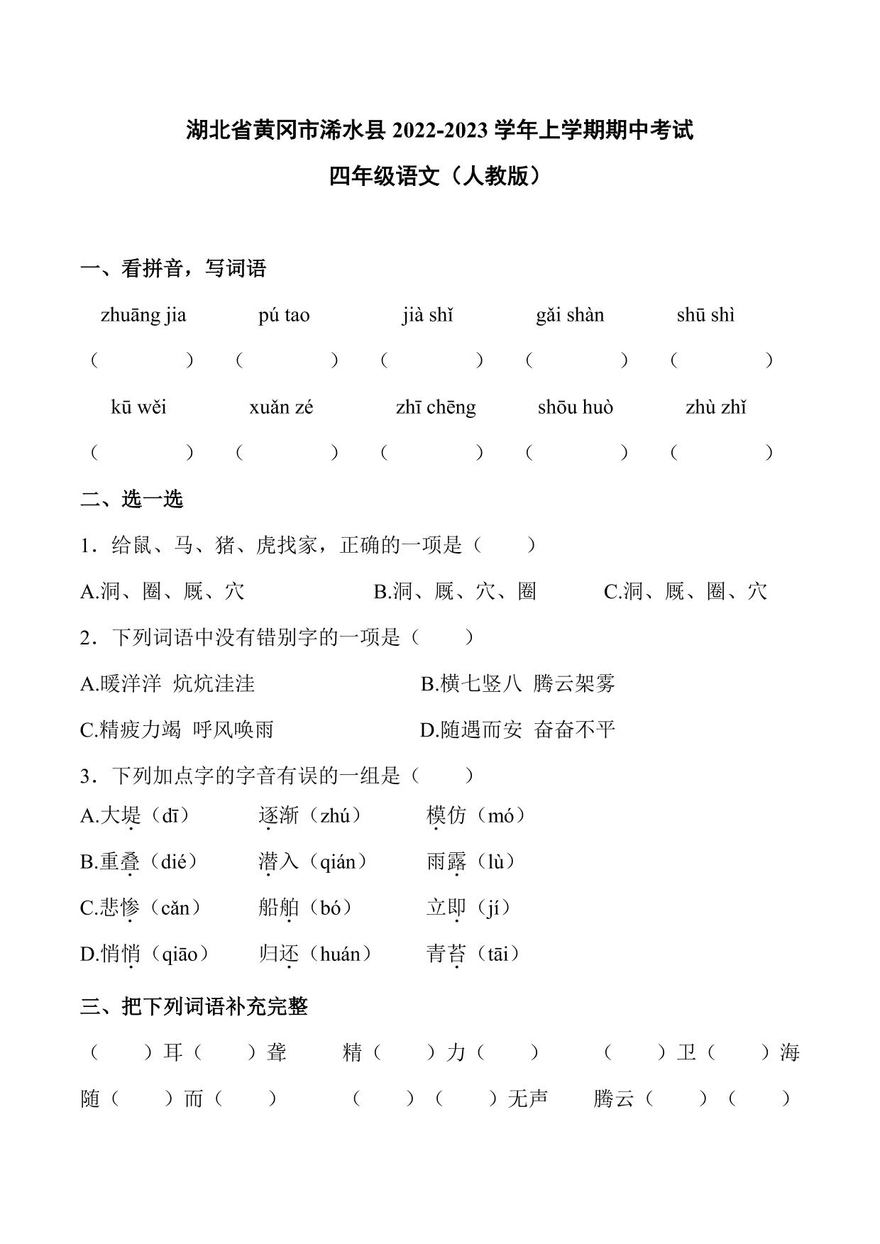 湖北省黄冈市浠水县2022-2023学年上学期期中考试四年级语文(人教版)