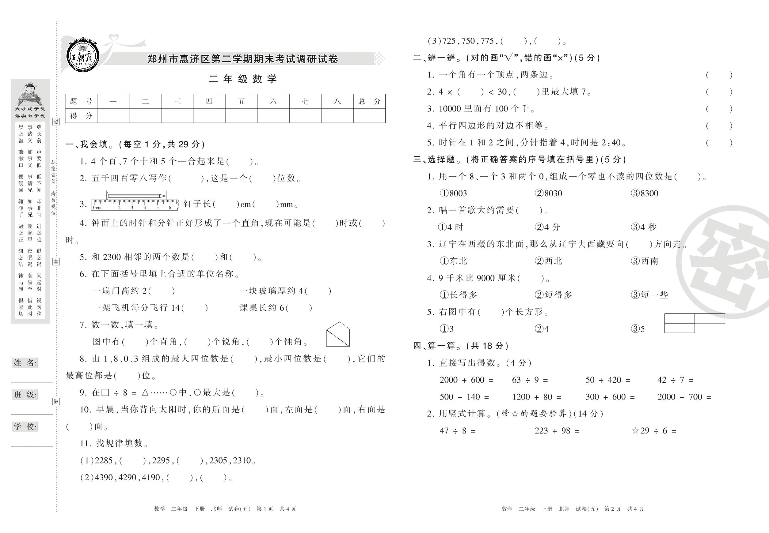 2015-2016学年第二学期郑州市惠济区二年级数学试卷(北师版)【5】