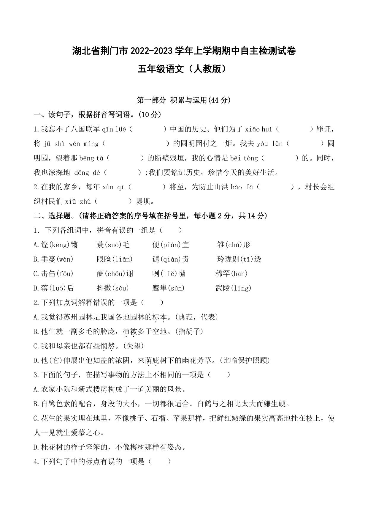 湖北省荆门市2022-2023学年上学期期中自主检测试卷五年级语文(人教版)