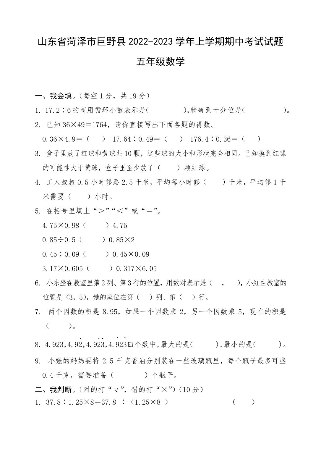 山东省菏泽市巨野县2022-2023学年五年级上学期期中考试数学试题(人教版)