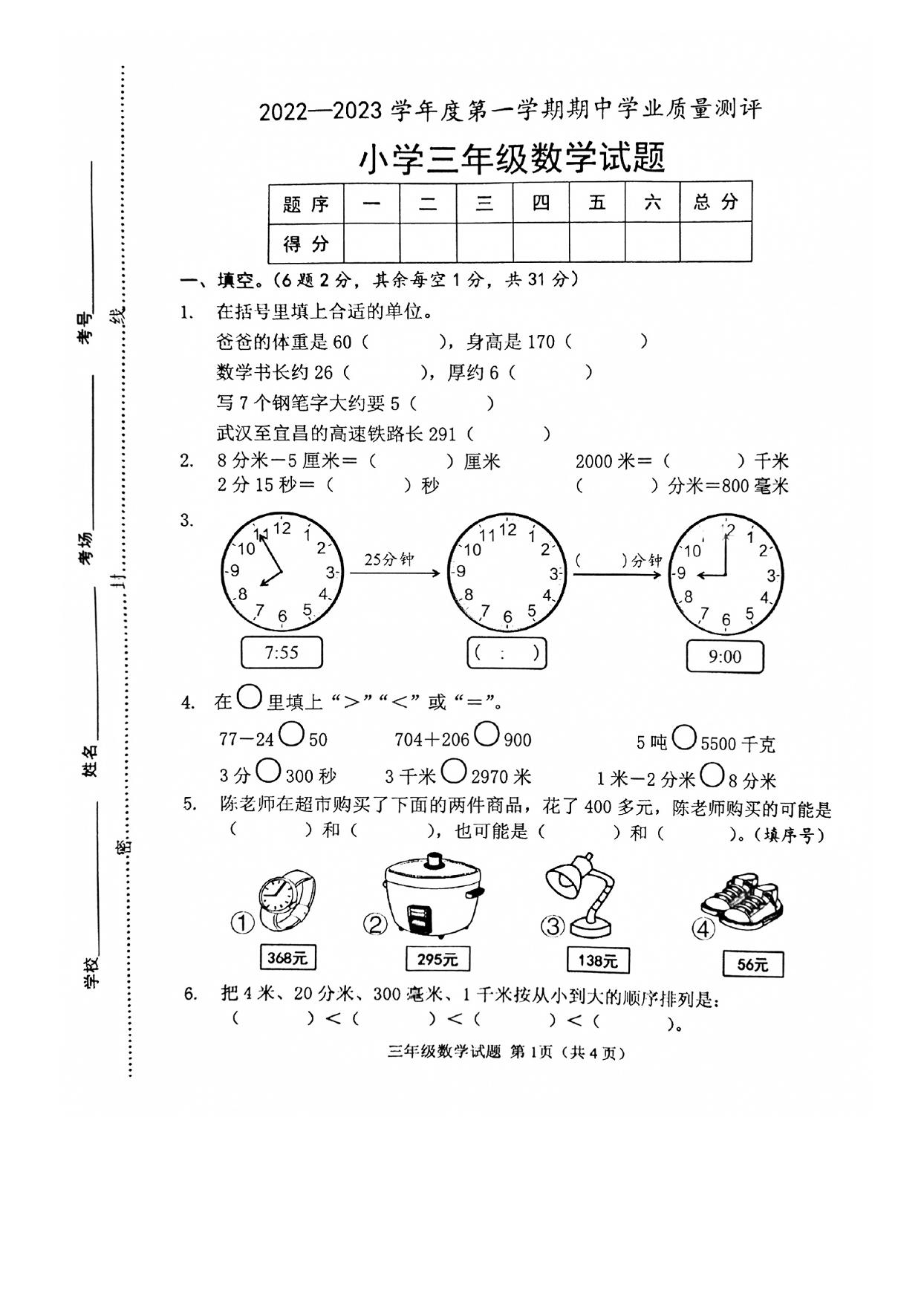 山东省菏泽市成武县2022-2023学年三年级上学期11月期中数学试题(人教版)