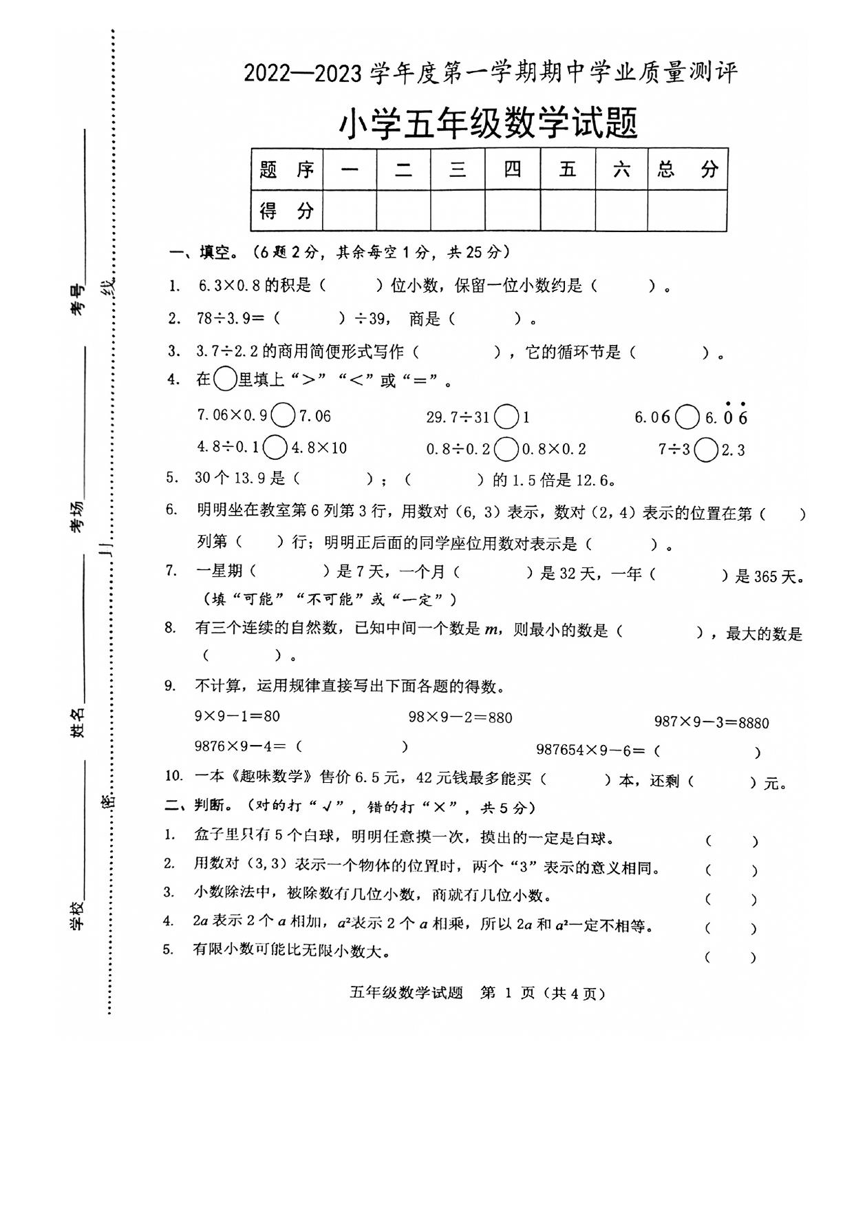山东省菏泽市成武县2022-2023学年五年级上学期11月期中数学试题(人教版)