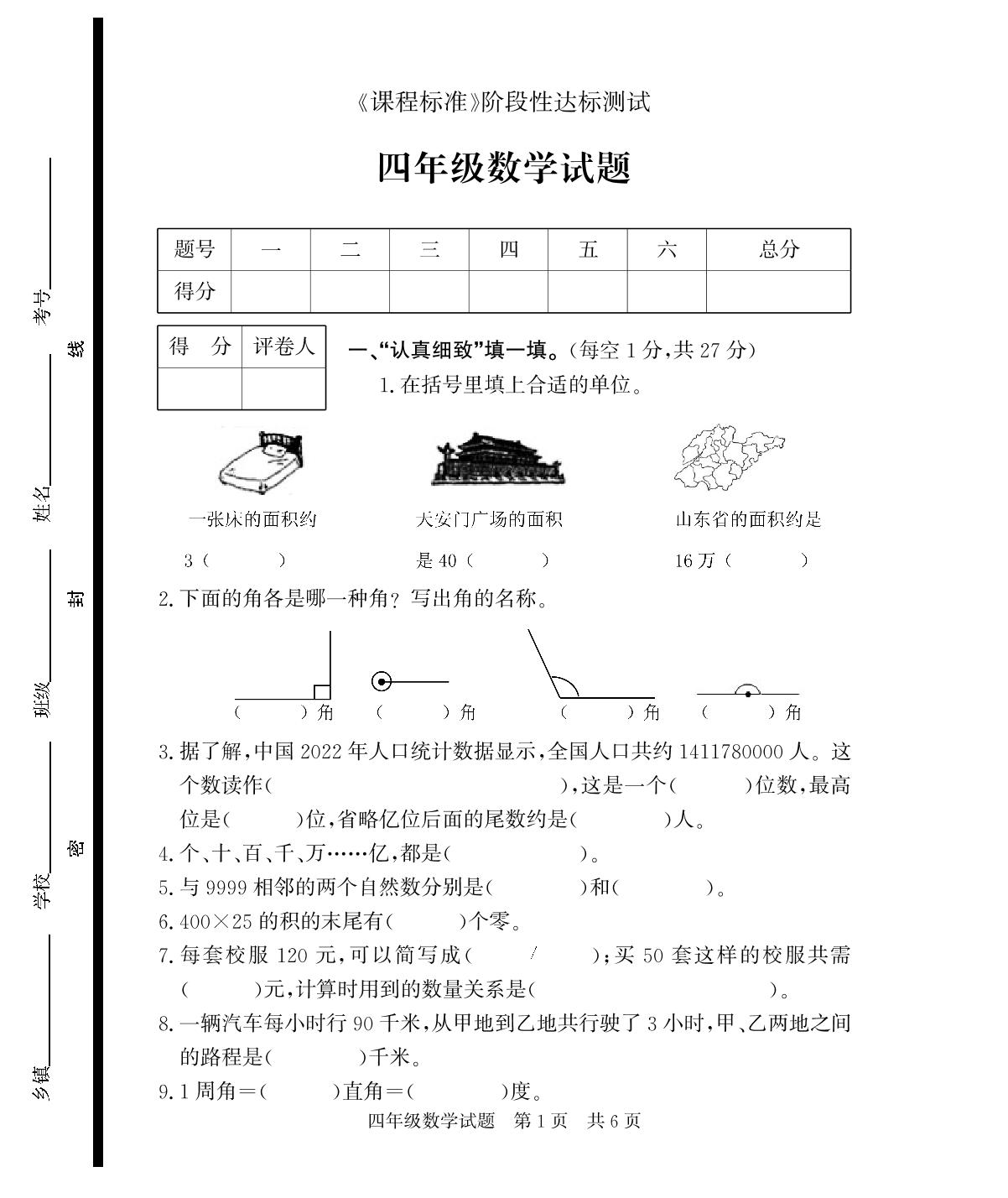 山东省济宁市泗水县2022-2023学年四年级上学期期中考试数学试题(人教版)