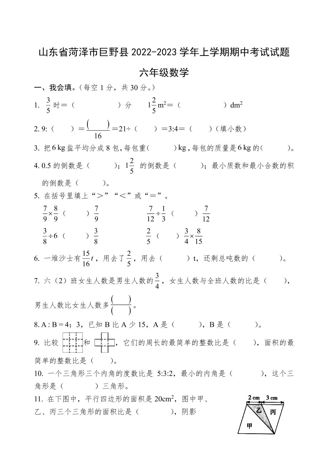 山东省菏泽市巨野县2022-2023学年六年级上学期期中考试数学试题(人教版)