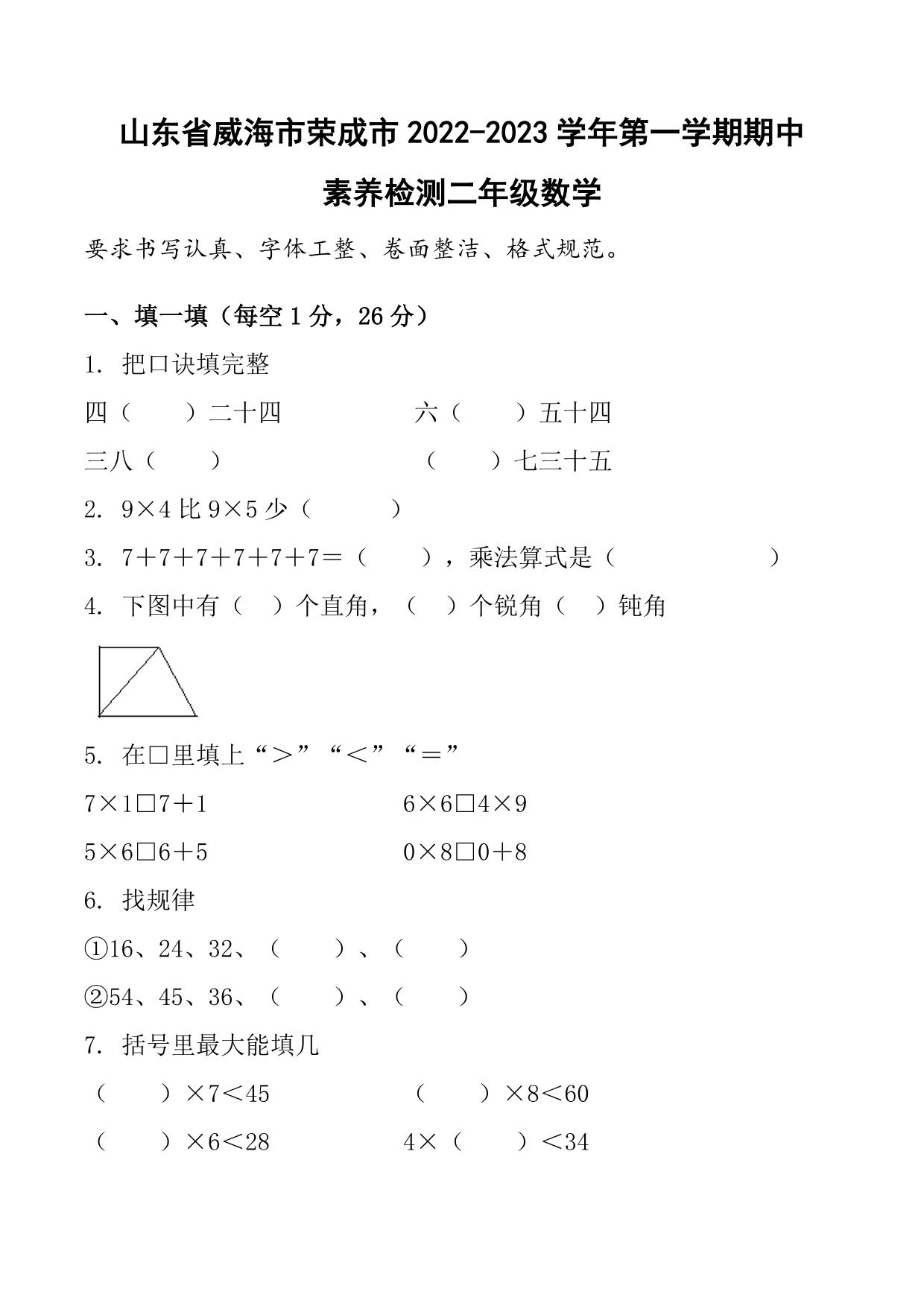山东省威海市荣成市2022-2023学年二年级上学期期中联考数学试题(青岛版)