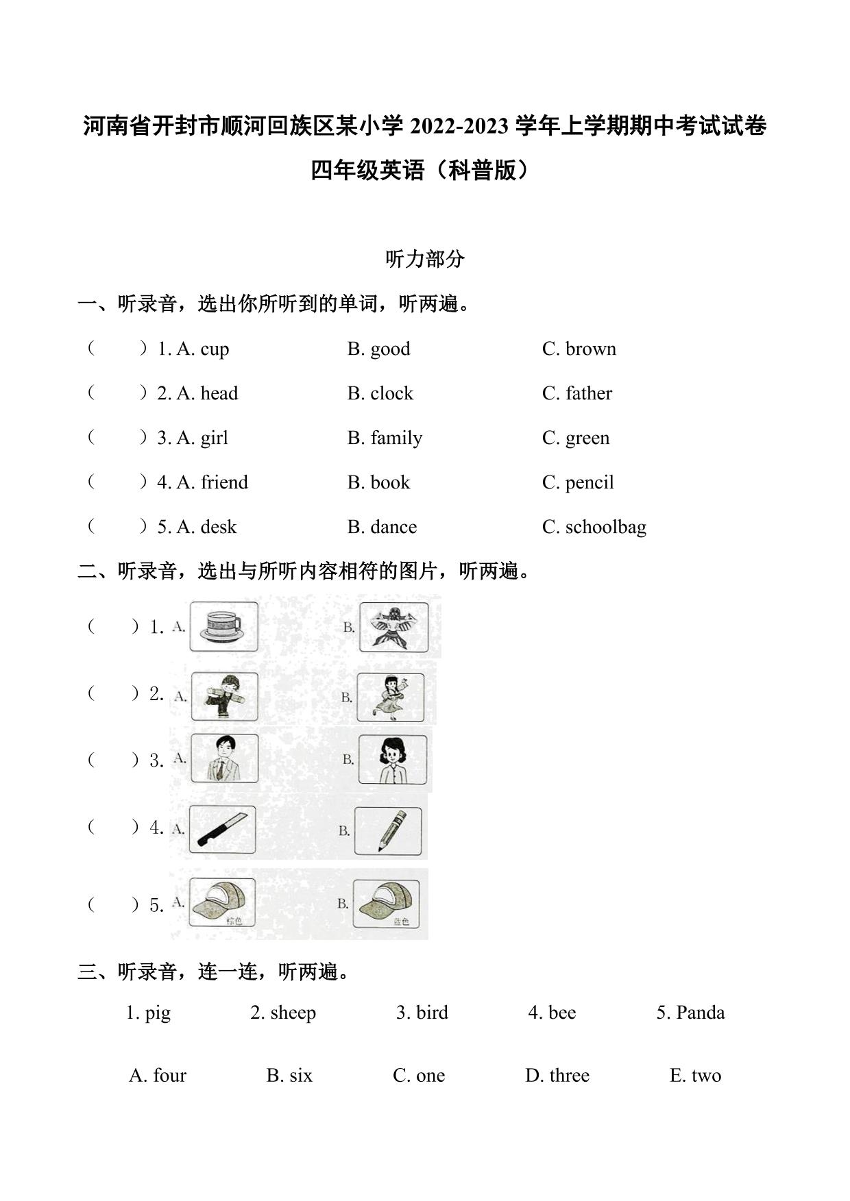 河南省开封市顺河回族区某小学2022-2023学年上学期期中考试试卷四年级英语(科普版)【无听力音频】