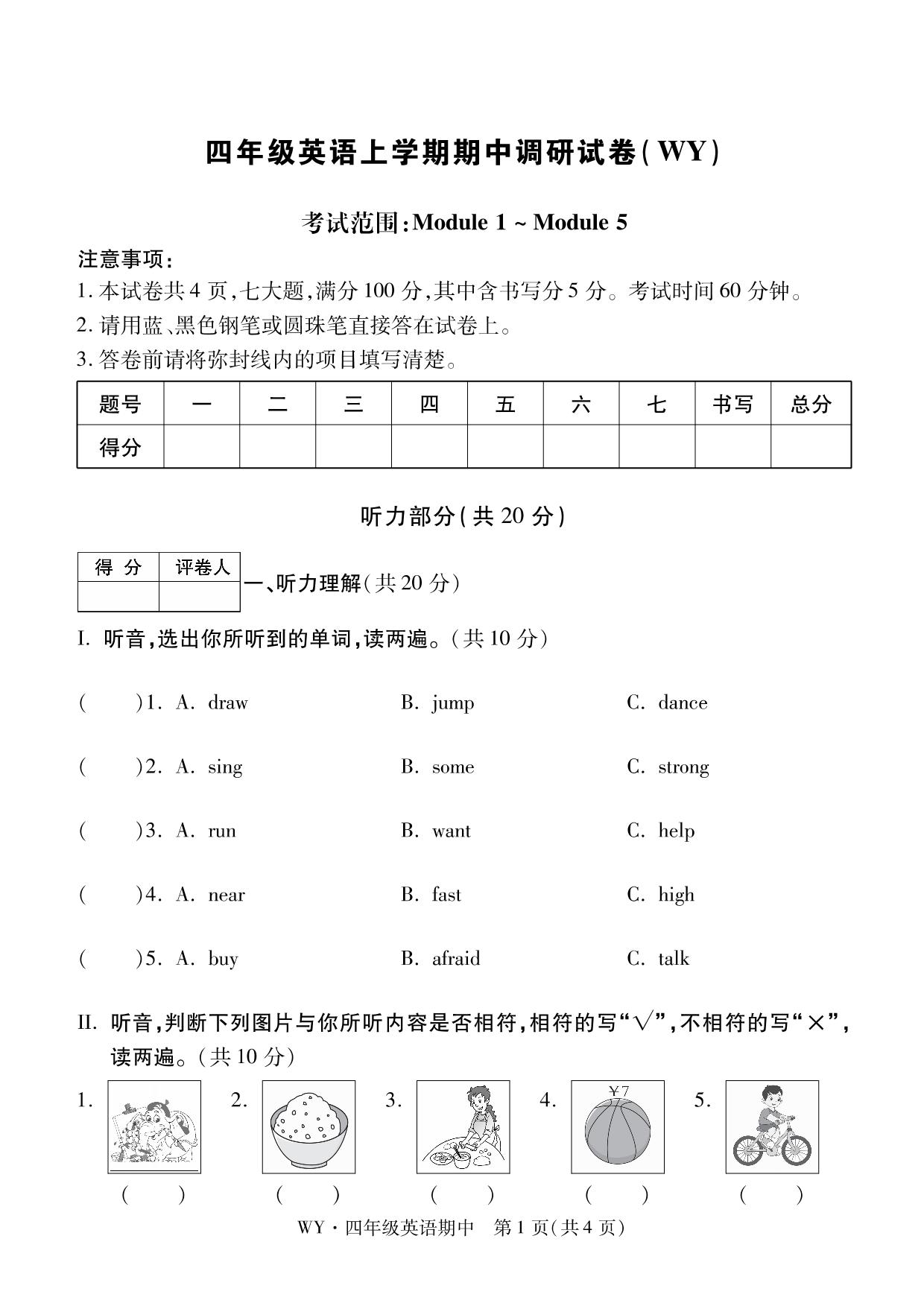 四年级英语外研版(三起始)上册期中卷