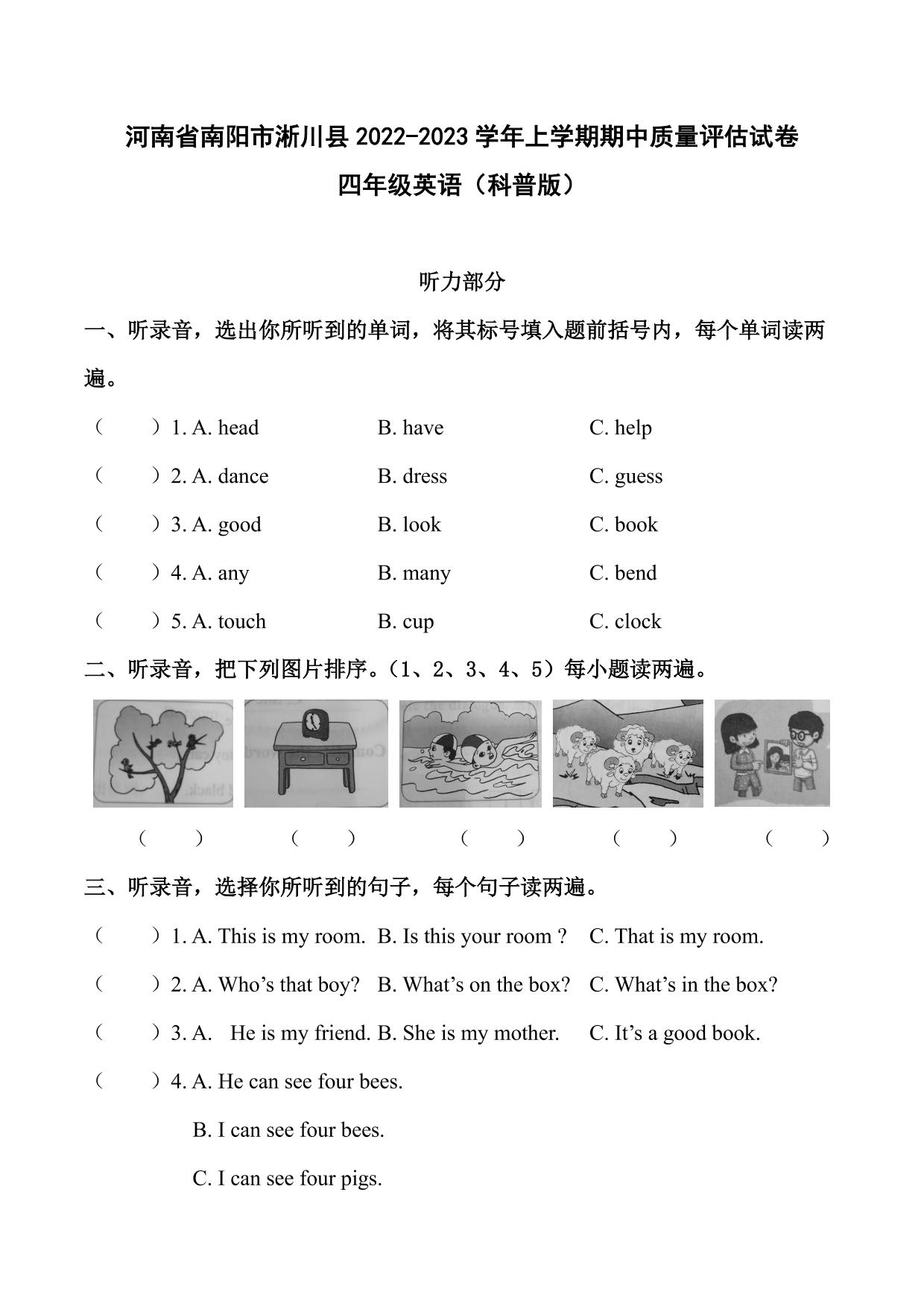 河南省南阳市淅川县2022-2023学年上学期期中质量评估试卷四年级英语(科普版)【无听力音频】
