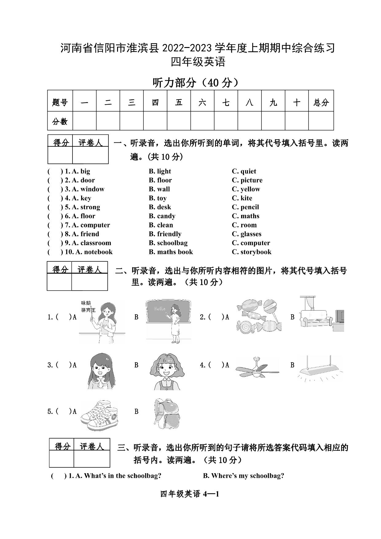河南省信阳市淮滨县2022-2023学年度上学期期中综合练习四年级英语(人教PEP版)【无听力音频】