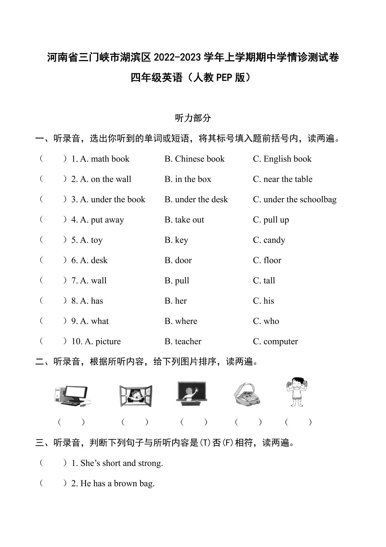 河南省三门峡市湖滨区2022-2023学年上学期期中学情诊测试卷四年级英语(人教PEP版)【无听力音频】