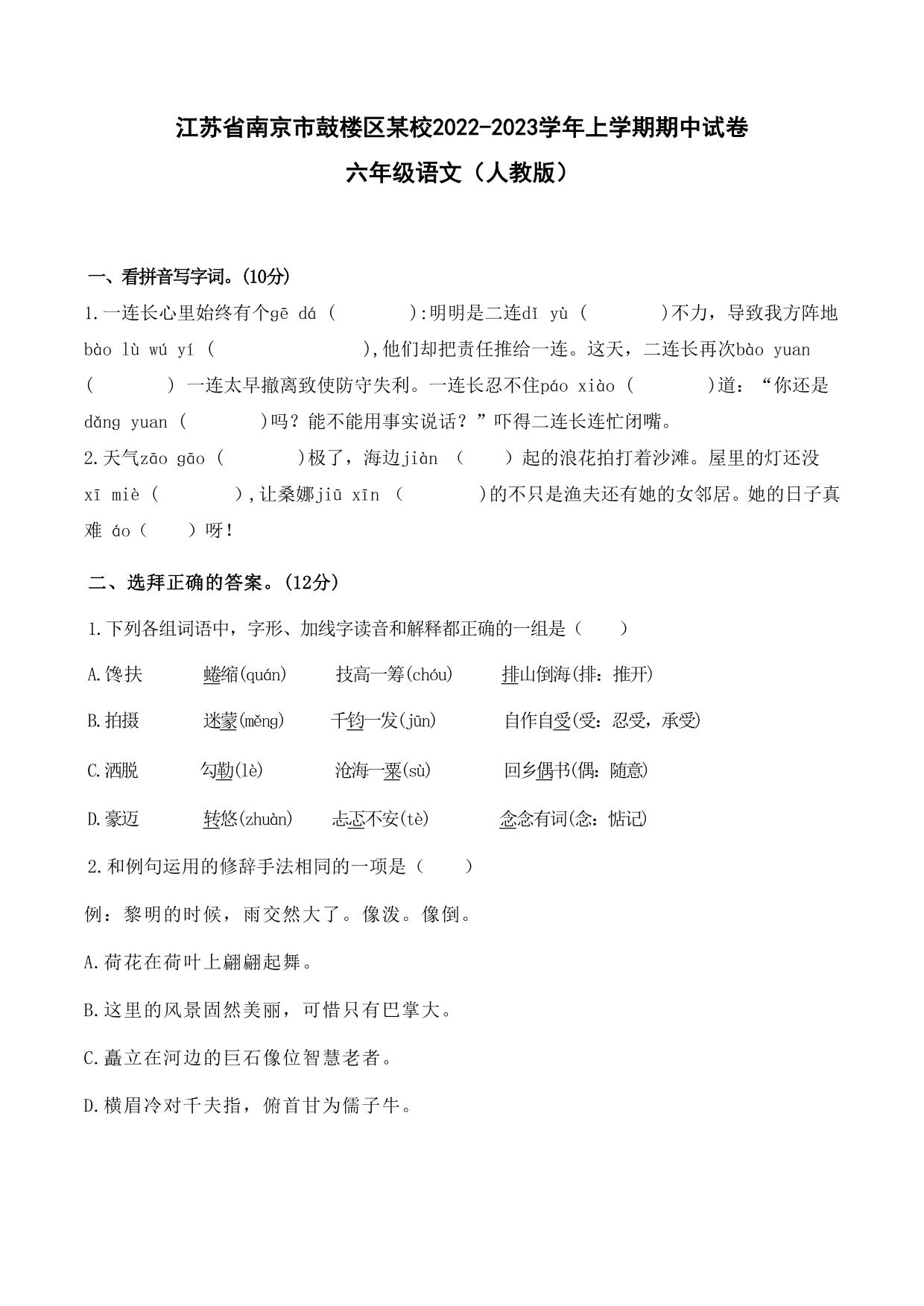 江苏省南京市鼓楼区某校2022-2023学年上学期期中试卷六年级语文(人教版)