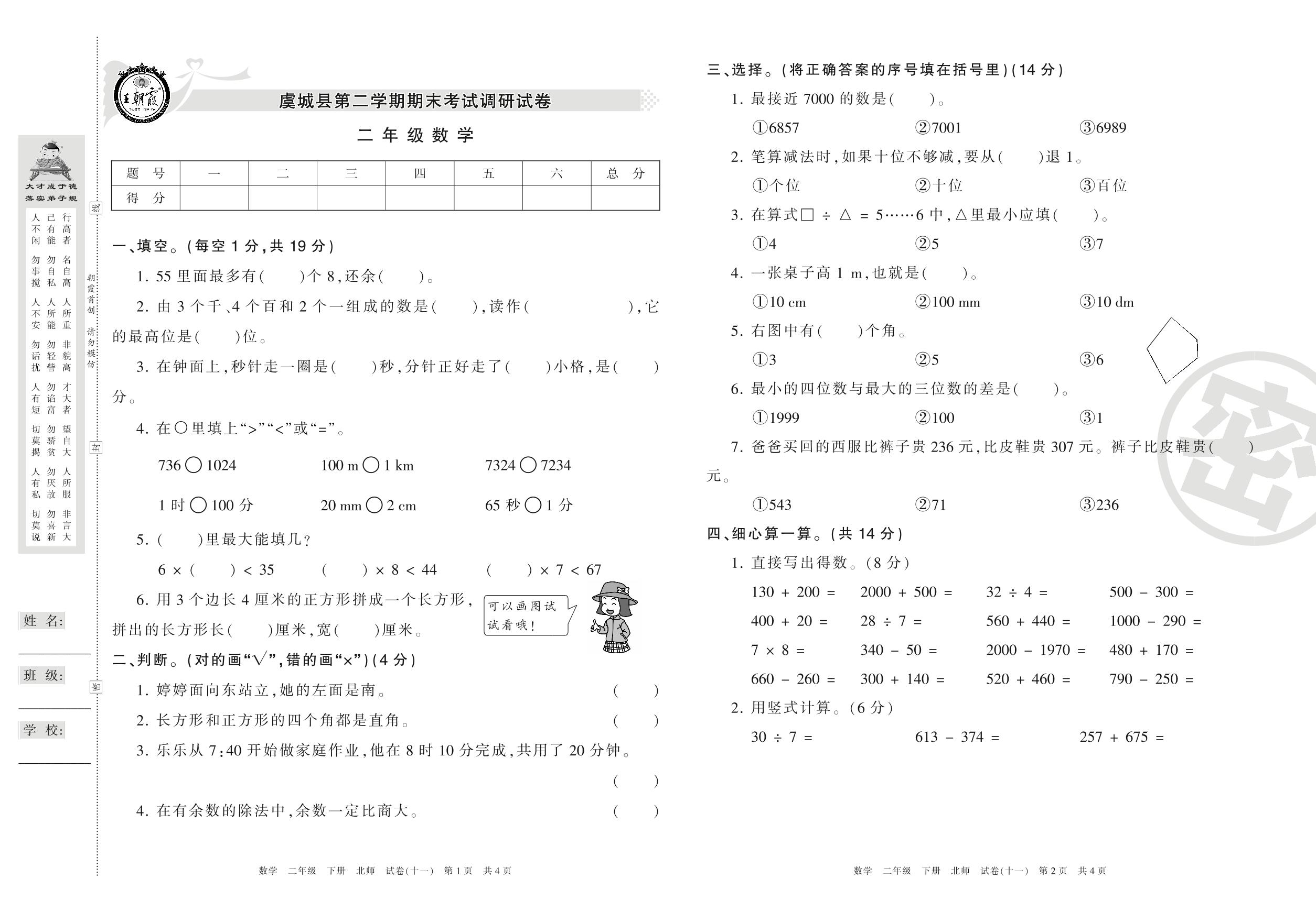 二年级数学北师版下册期末卷