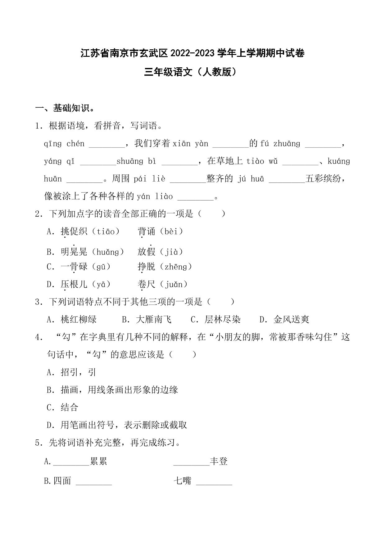 江苏省南京市玄武区2022-2023学年上学期期中试卷三年级语文(人教版)