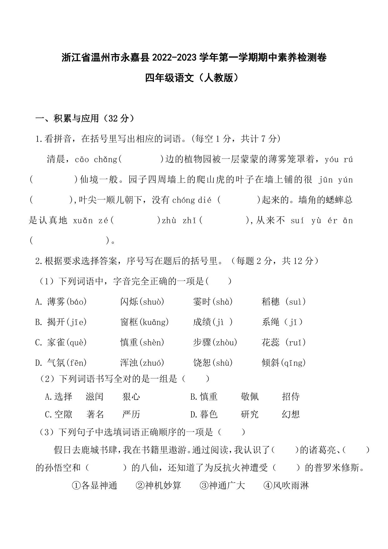浙江省温州市永嘉县某校2022-2023学年第一学期期中素养检测卷四年级语文(人教版)