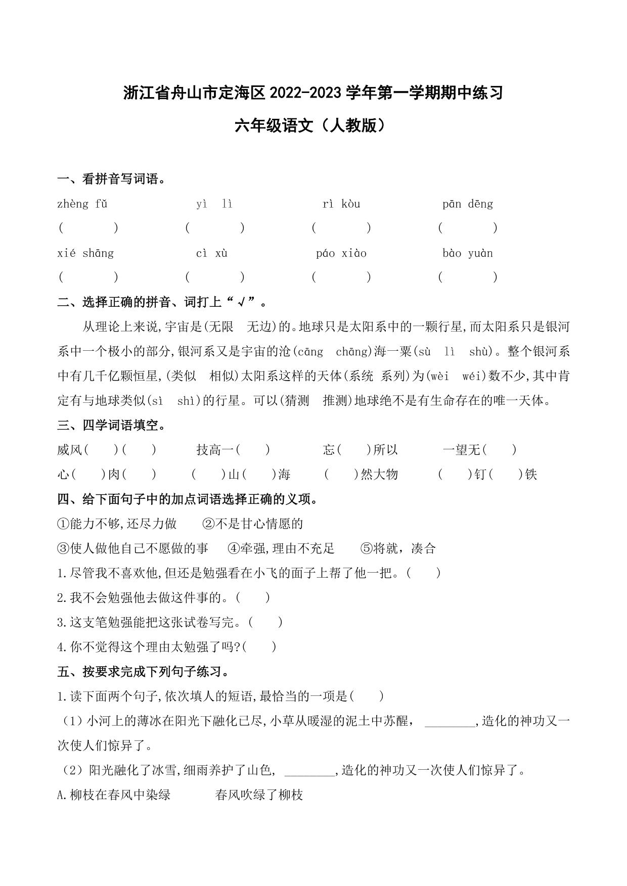 浙江省舟山市定海区2022-2023学年第一学期期中练习六年级语文(人教版)