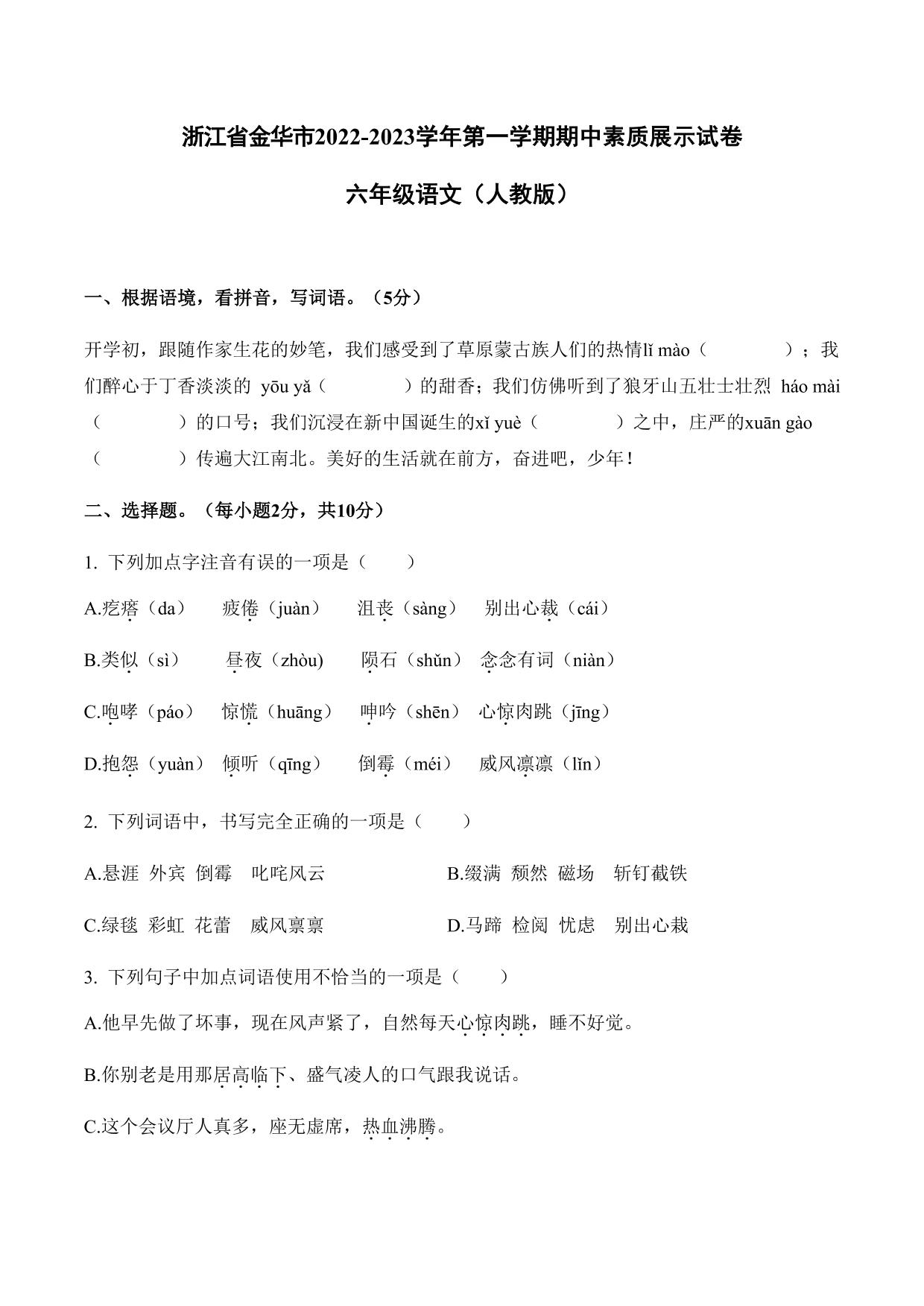 浙江省金华市某校2022-2023学年第一学期期中素质展示试卷六年级语文(人教版)