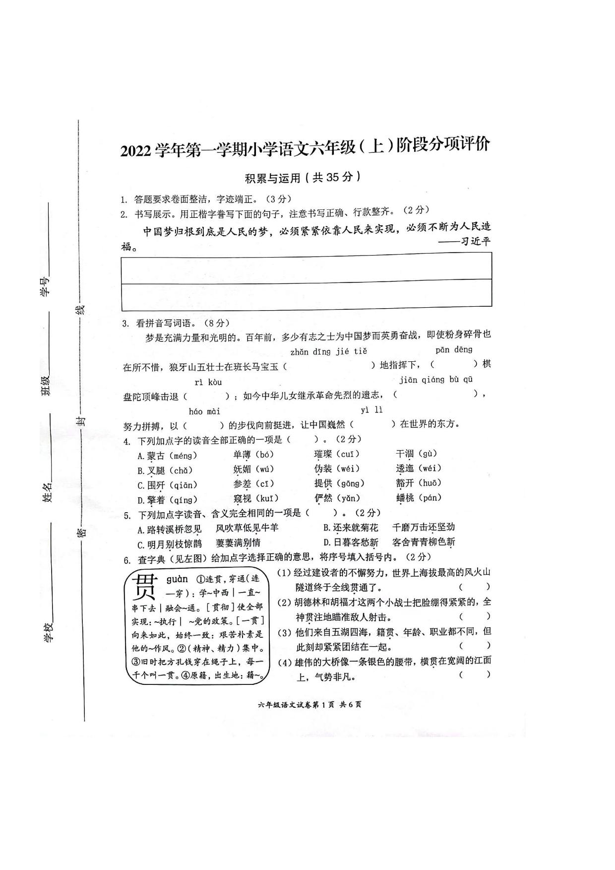 浙江省温州市瑞安市2022-2023学年第一学期阶段分项评价六年级语文(人教版)