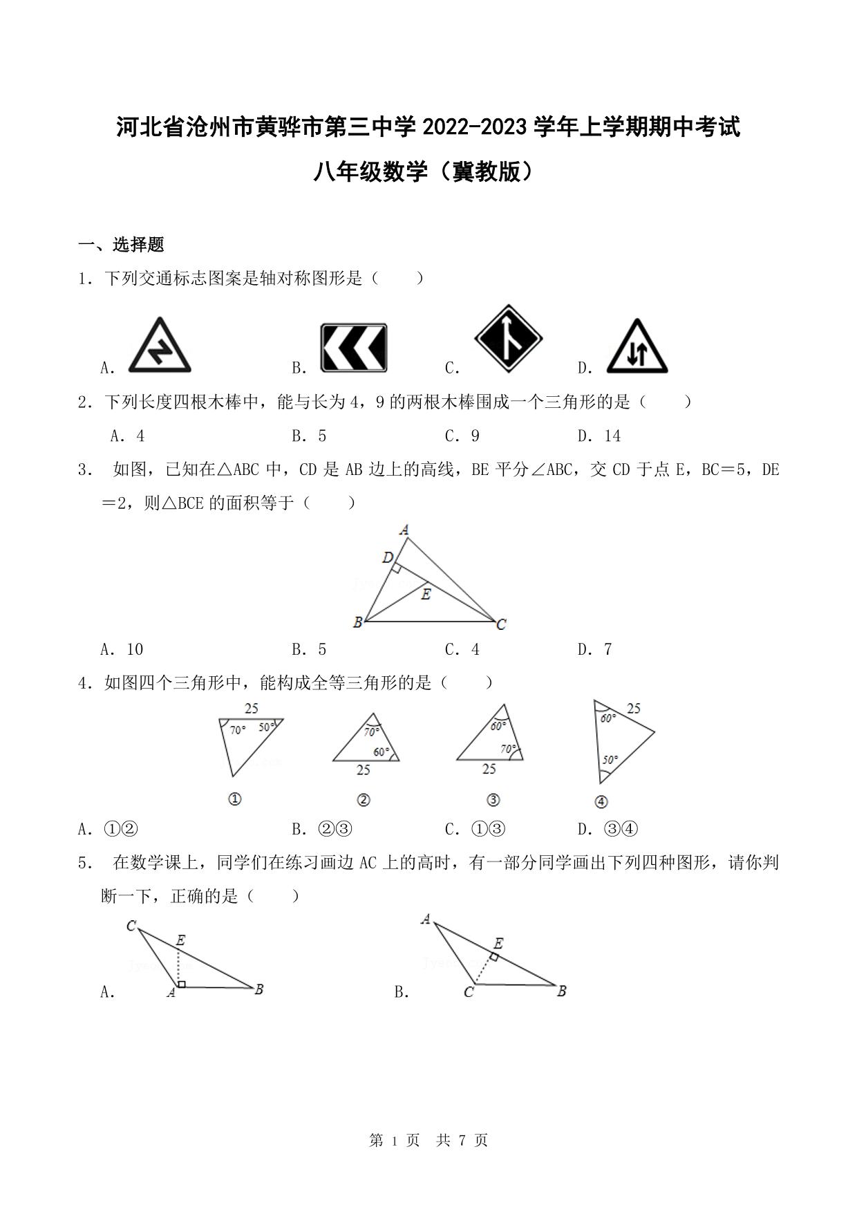 河北省沧州市黄骅市第三中学2022-2023学年上学期期中考试八年级数学(冀教版)