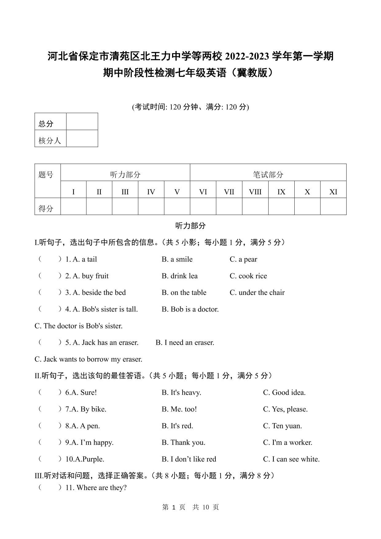 河北省保定市清苑区北王力中学等2校2022-2023学年第一学期期中阶段性检测七年级英语(冀教版)【无听力音频】