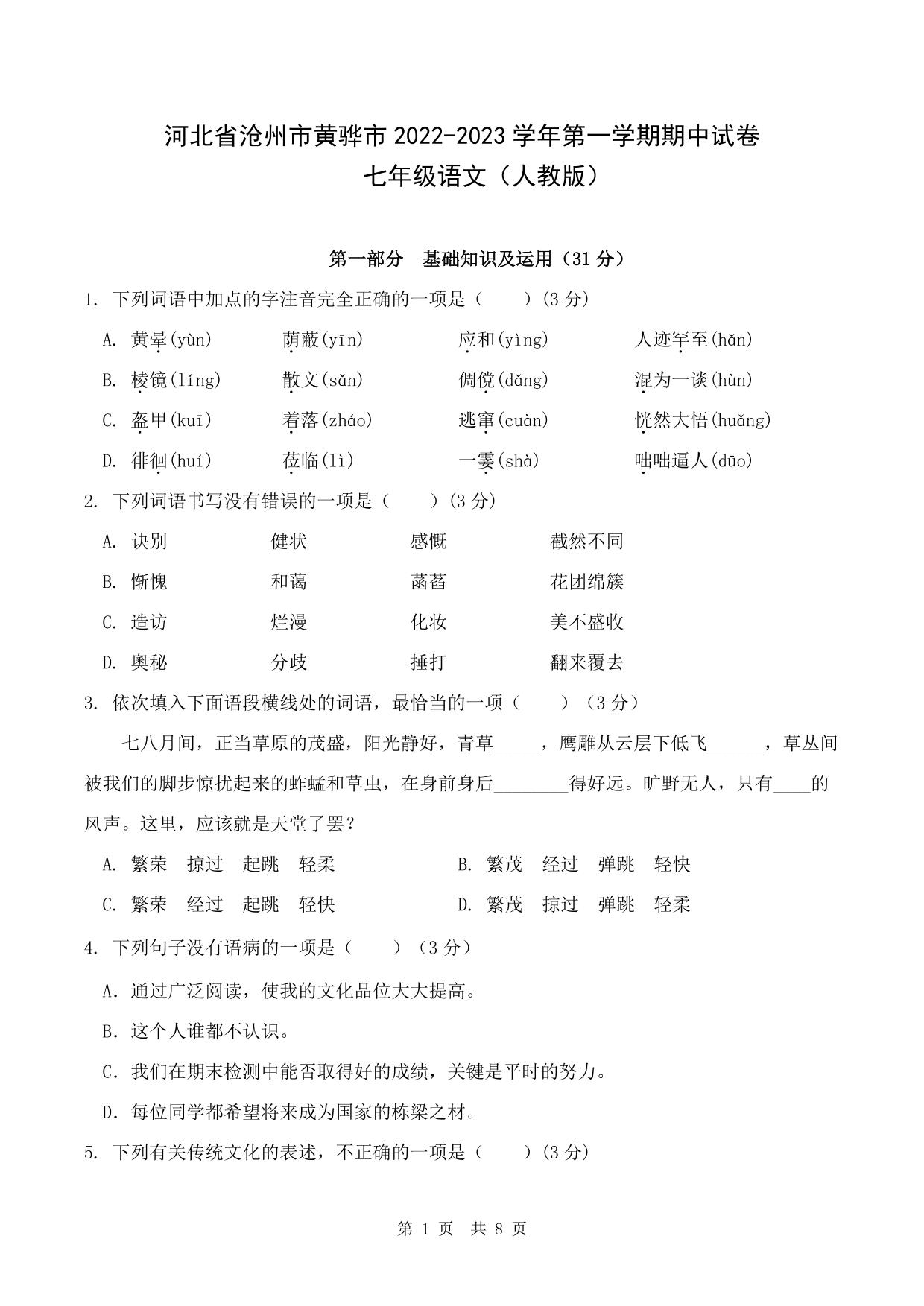 河北省沧州市黄骅市第三中学2022-2023学年第一学期期中试卷七年级语文(人教版)
