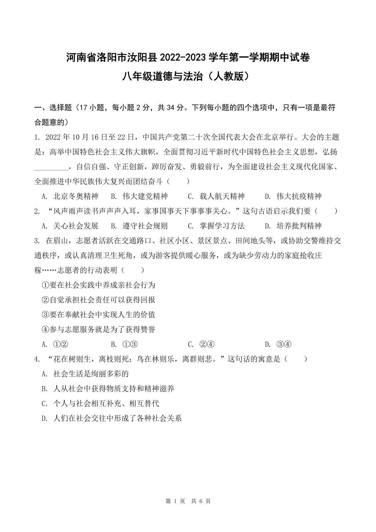 河南省洛阳市汝阳县2022-2023学年第一学期期中试卷八年级道德与法治(人教版)