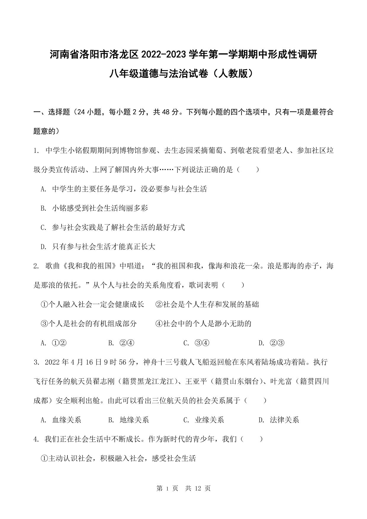河南省洛阳市洛龙区2022-2023学年第一学期期中形成性调研八年级道德与法治(人教版)