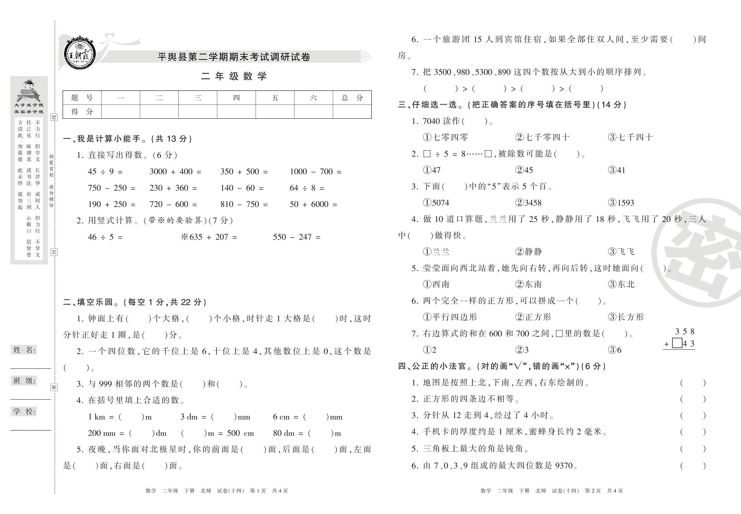 2015-2016学年第二学期驻马店市平舆县二年级数学试卷(北师版)【14】