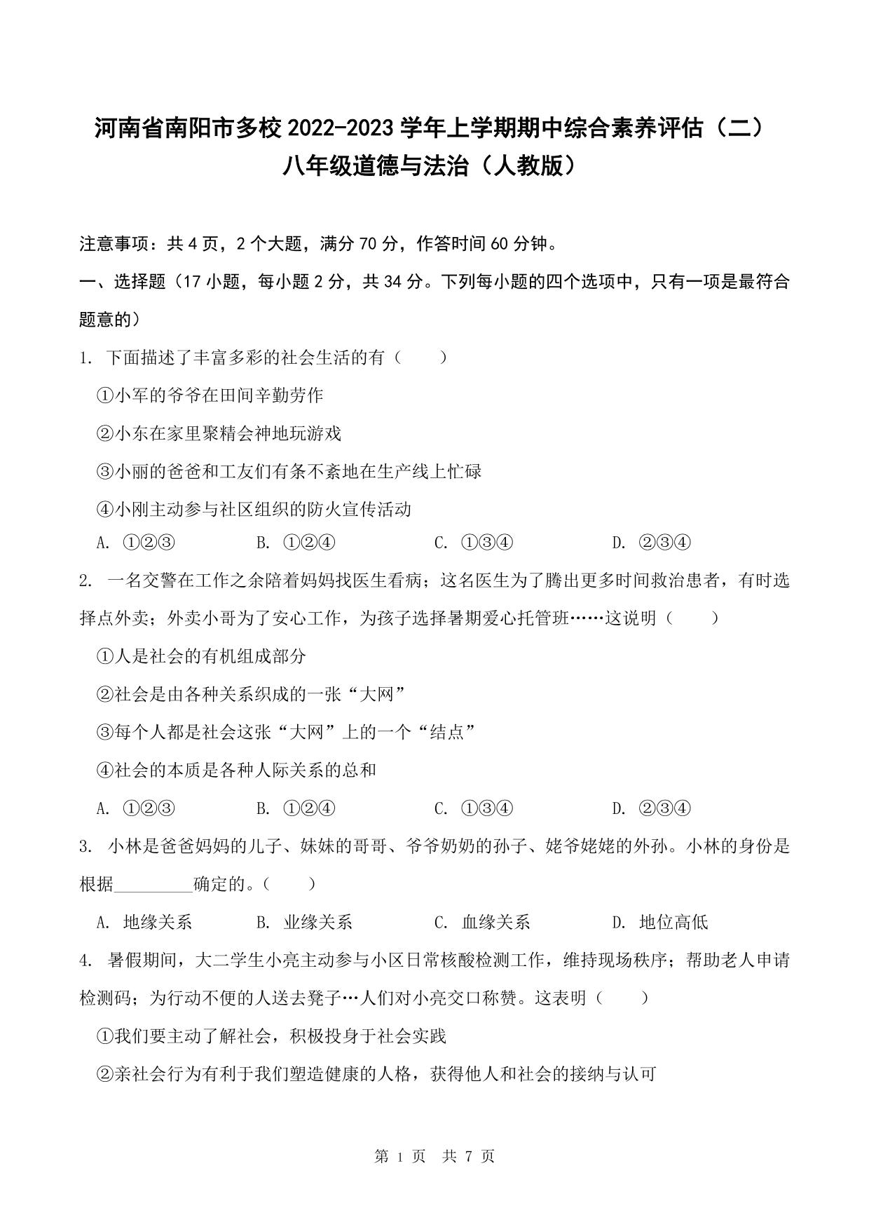 河南省南阳市多校2022-2023学年上学期期中综合素质评估(二)八年级道德与法治(人教版)