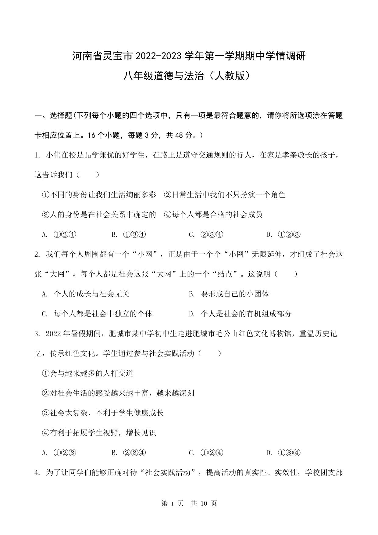 河南省灵宝市2022-2023学年第一学期期中学期调研八年级道德与法治(人教版)