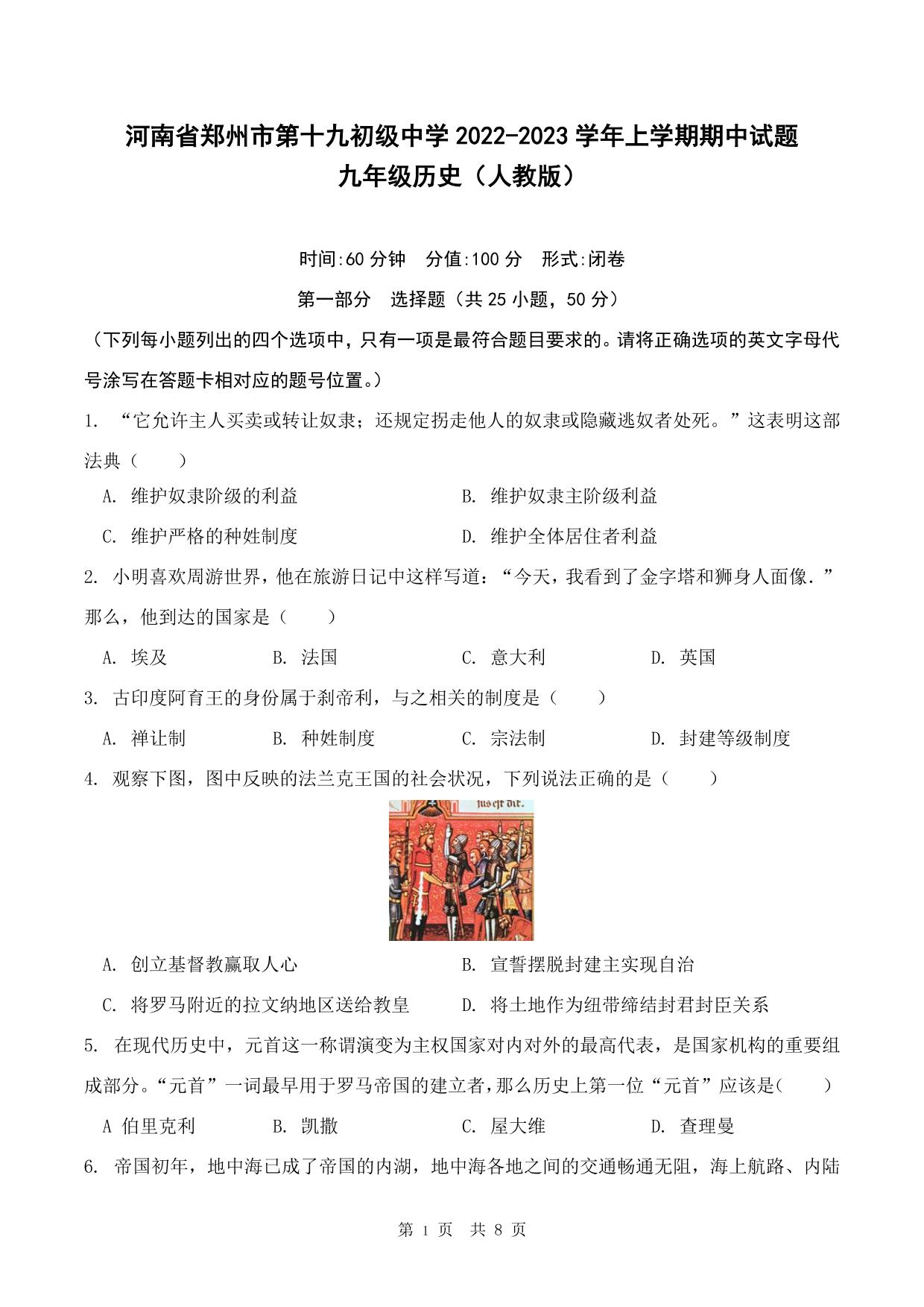 河南省郑州市第十九初级中学2022-2023学年上学期期中试题九年级历史(人教版)