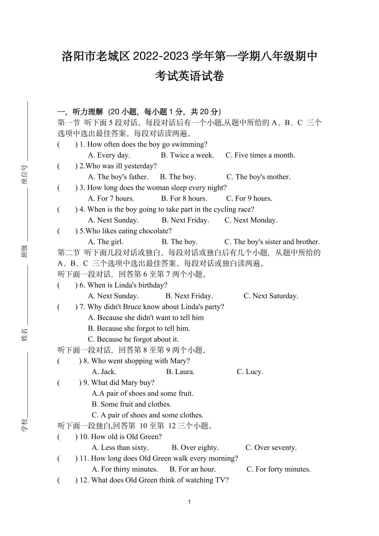 河南省洛阳市老城区2022-2023学年上学期期中测试试题八年级英语(人教版)【无听力音频】