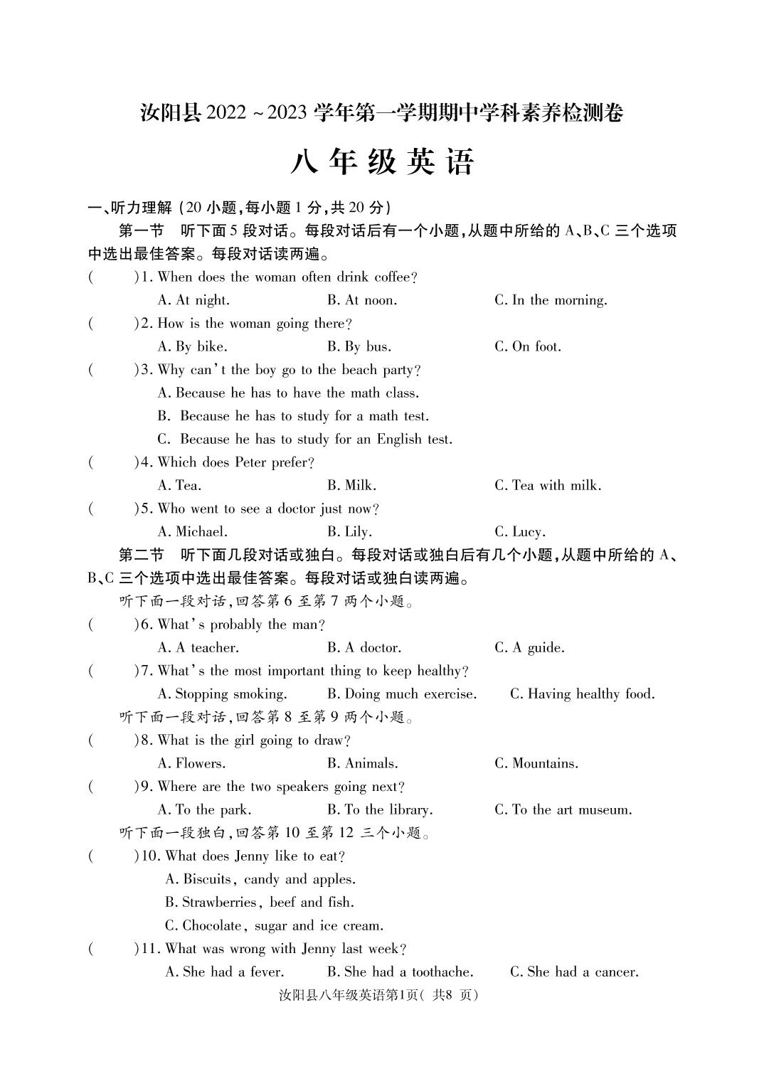 河南省洛阳市汝阳县2022-2023学年第一学期期中学科素养检测卷八年级英语(人教版)【无听力音频】