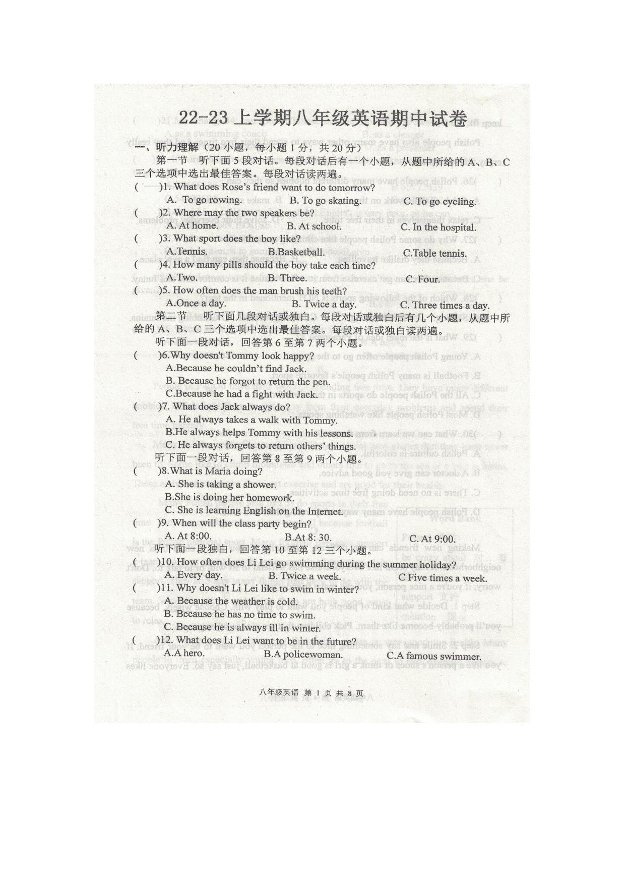 河南省鹤壁市浚县2022-2023学年上学期期中考试八年级英语(人教版)【无听力音频】