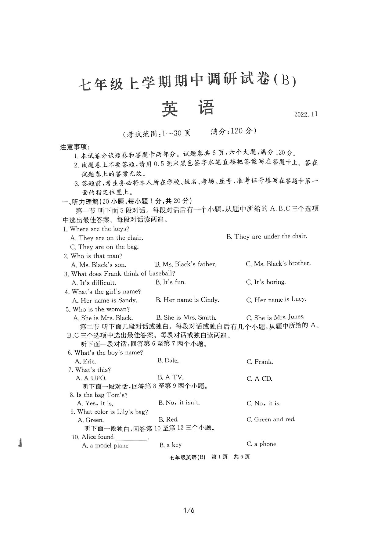 河南省安阳市林州市2022-2023学年上学期期中考试(B)七年级英语(人教版)【无听力音频】