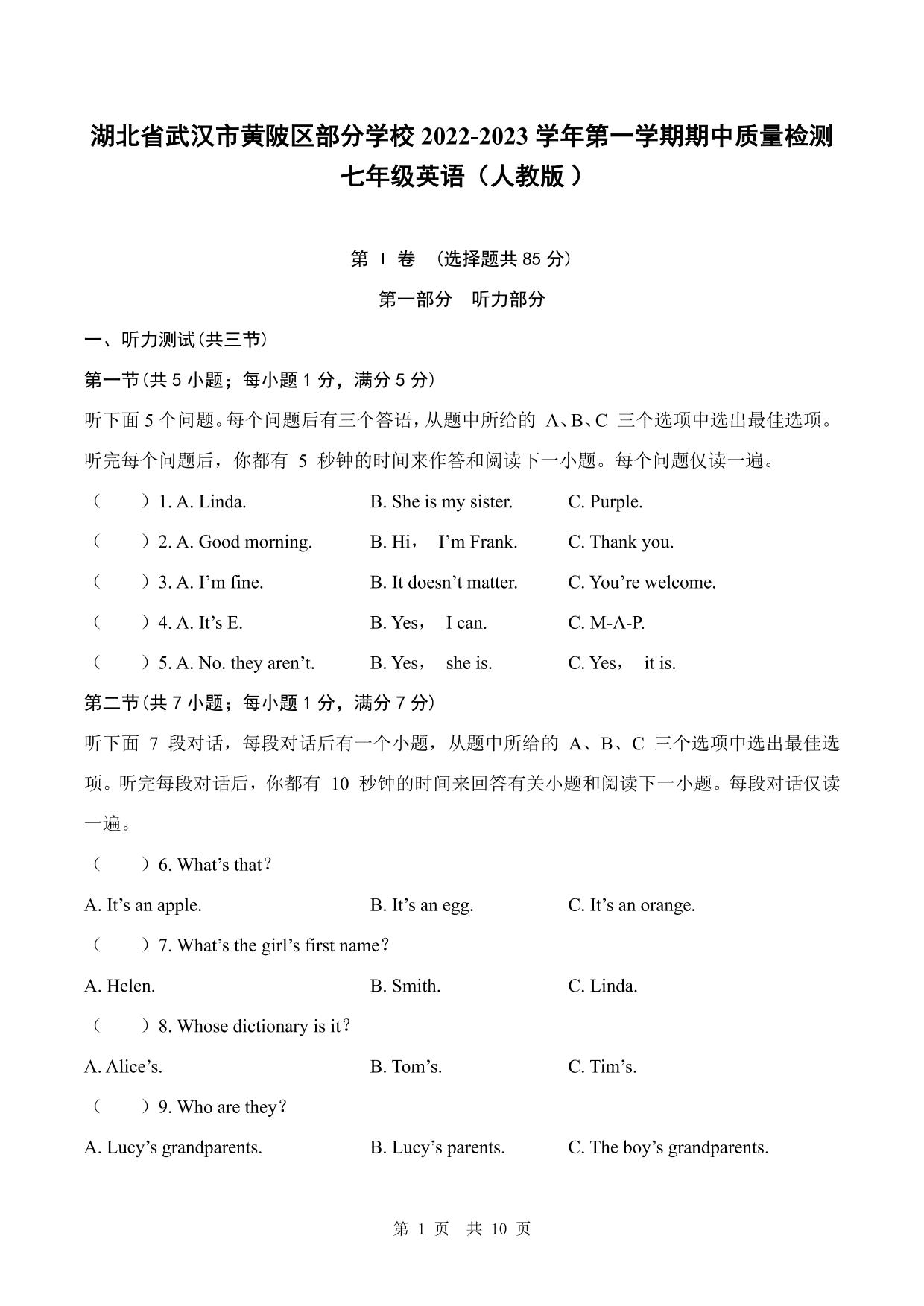 湖北省武汉市黄陂区部分学校2022-2023学年第一学期期中质量检测七年级英语(人教版)【无听力音频】