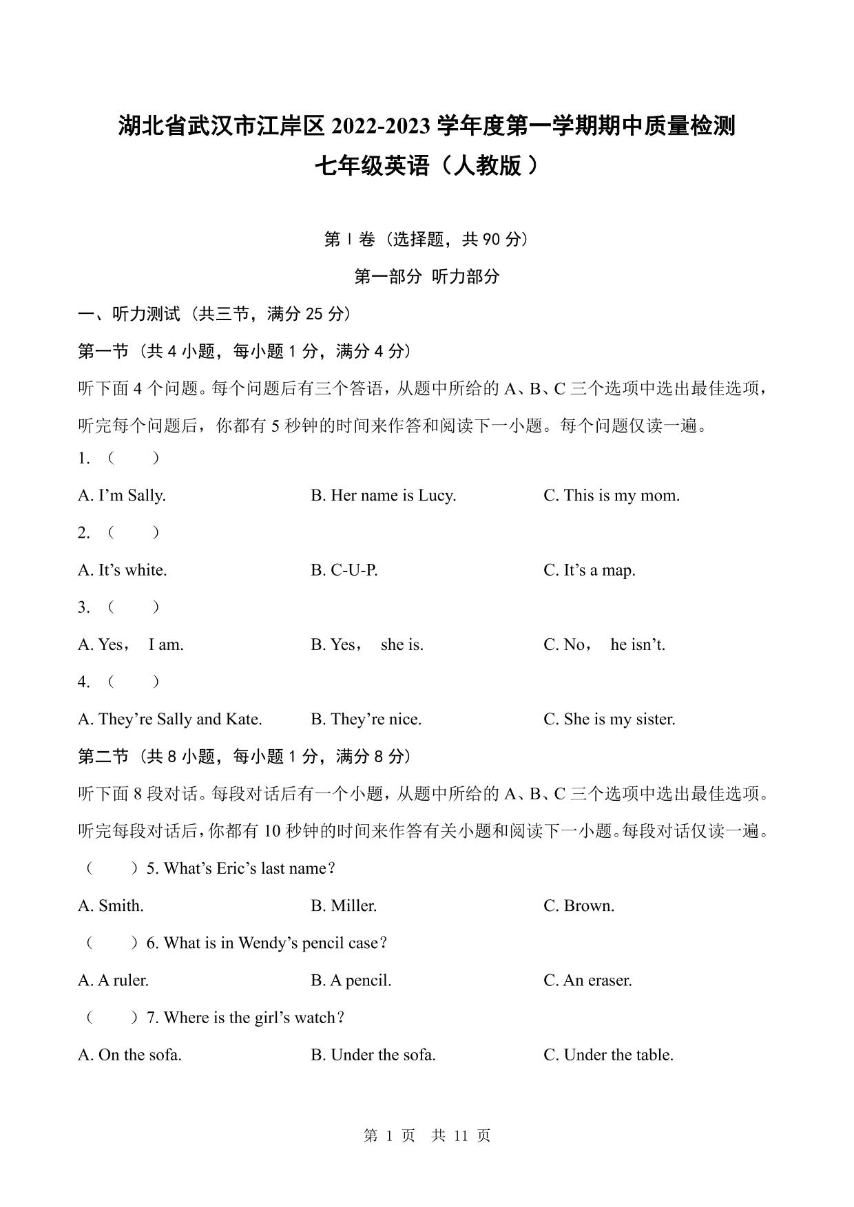 湖北省武汉市江岸区2022-2023学年度第一学期期中质量检测七年级英语(人教版)【无听力音频】