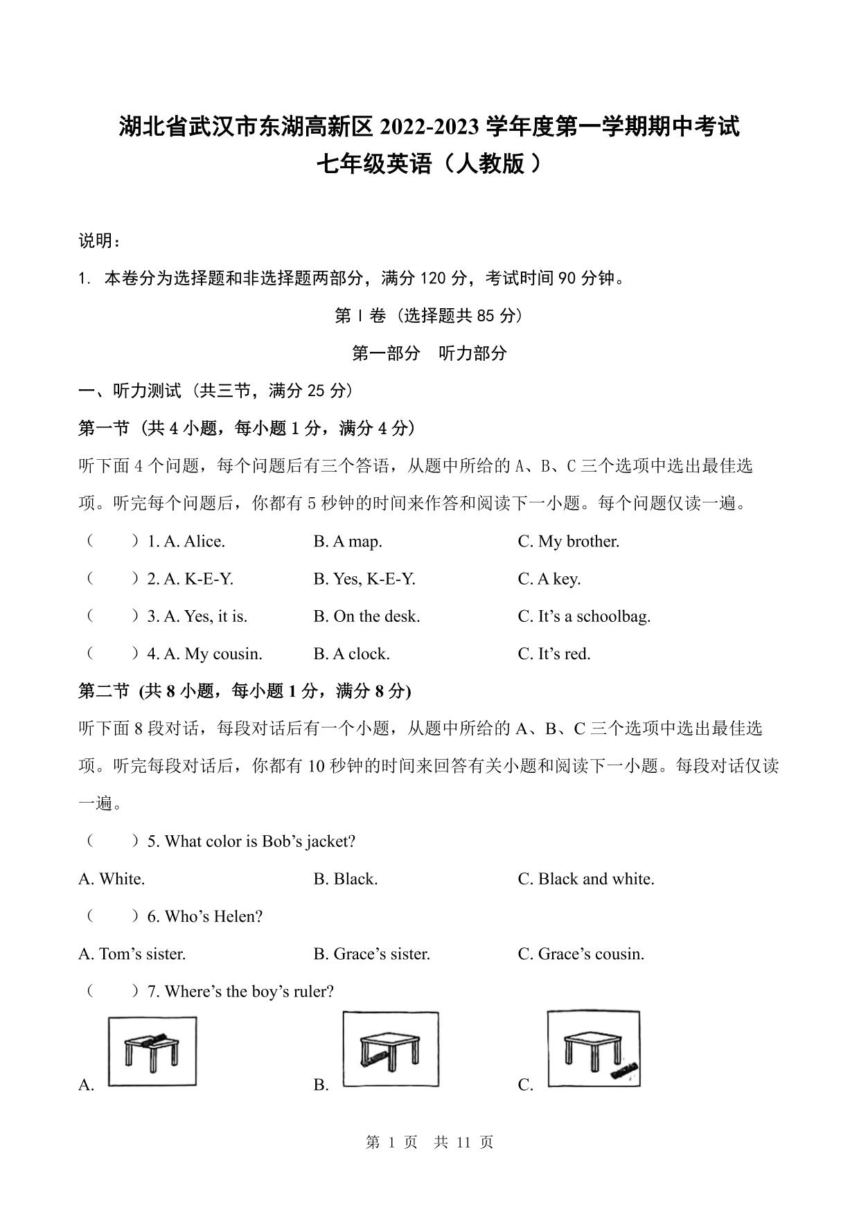 湖北省武汉市东湖高新区2022-2023学年度第一学期期中考试七年级英语(人教版)【无听力音频】