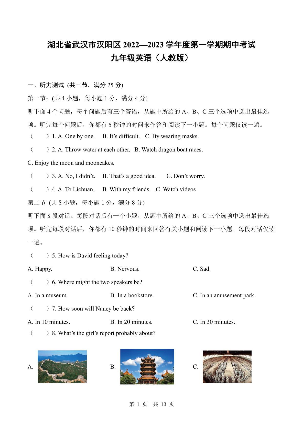 湖北省武汉市汉阳区2022-2023学年度第一学期期中考试九年级英语(人教版)【无听力音频】