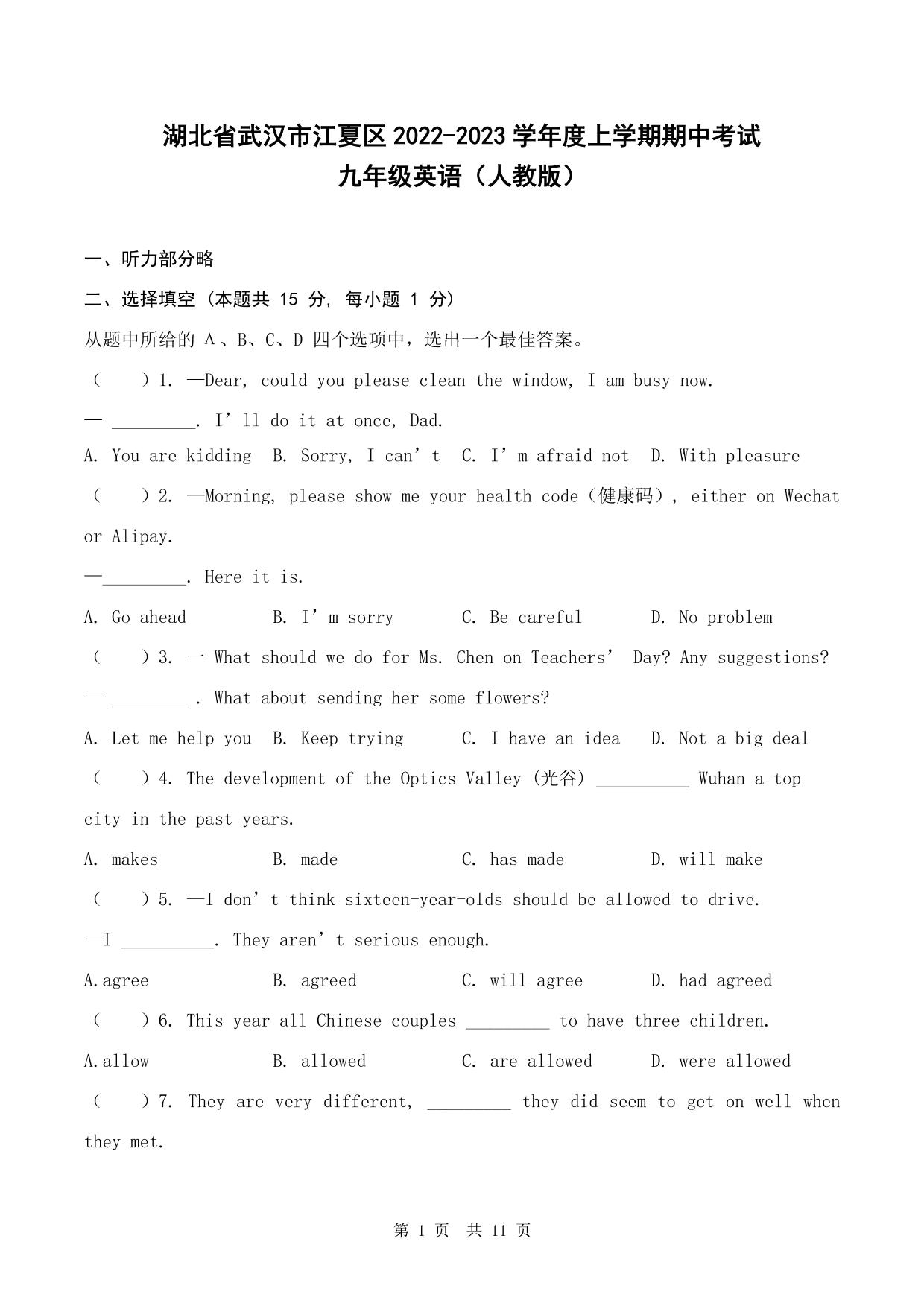湖北省武汉市江夏区2022-2023学年度上学期期中考试九年级英语(人教版)【无听力音频】