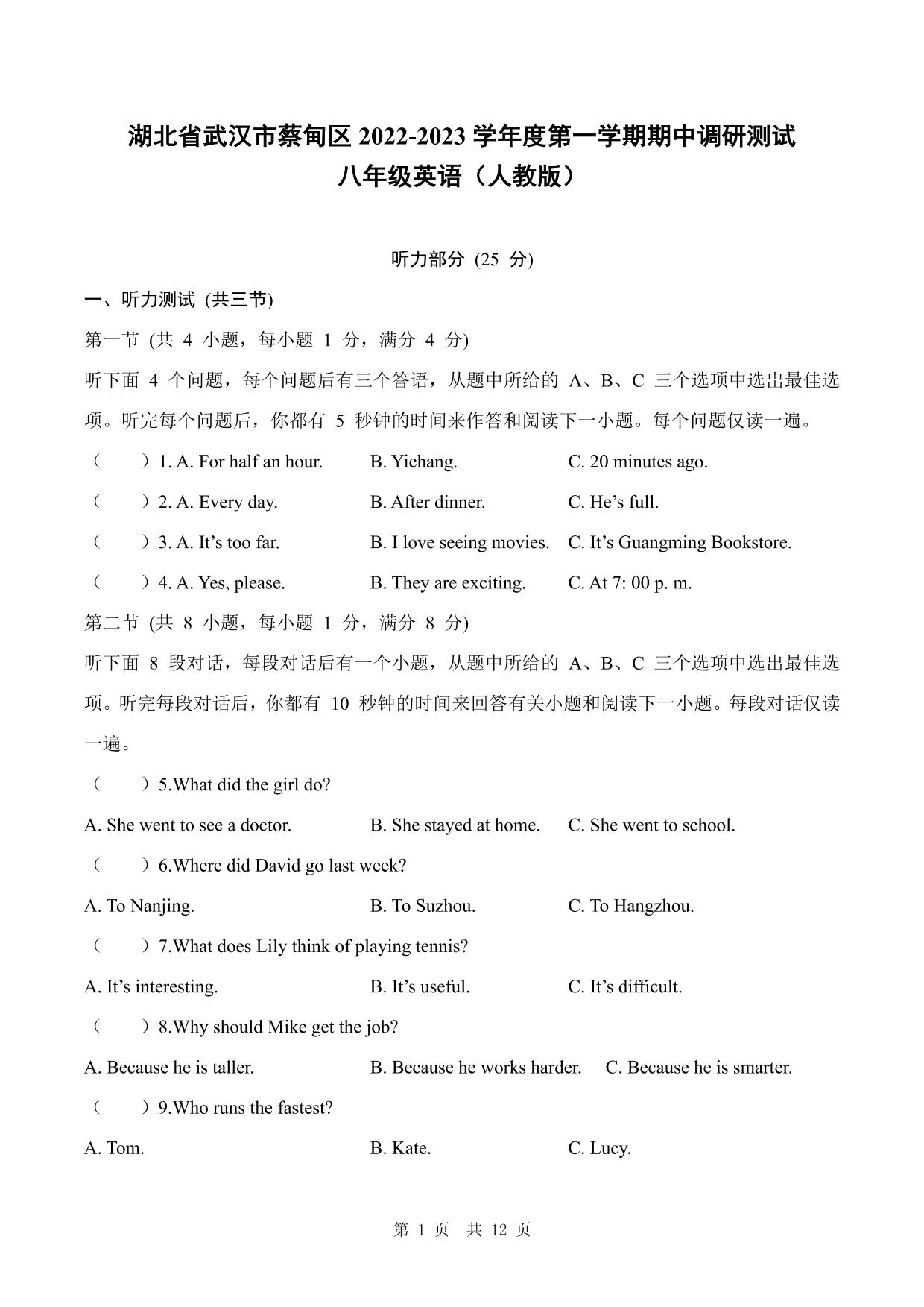 湖北省武汉市蔡甸区2022-2023学年度第一学期期中调研试卷八年级英语(人教版)【无听力音频】