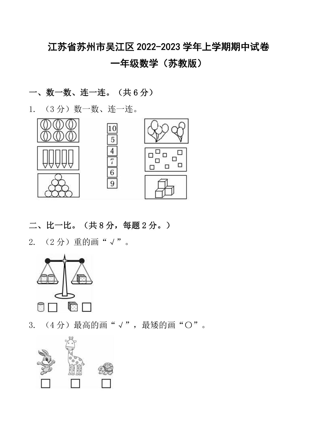 江苏省苏州市吴江区2022-2023学年上学期期中试卷一年级数学(苏教版)