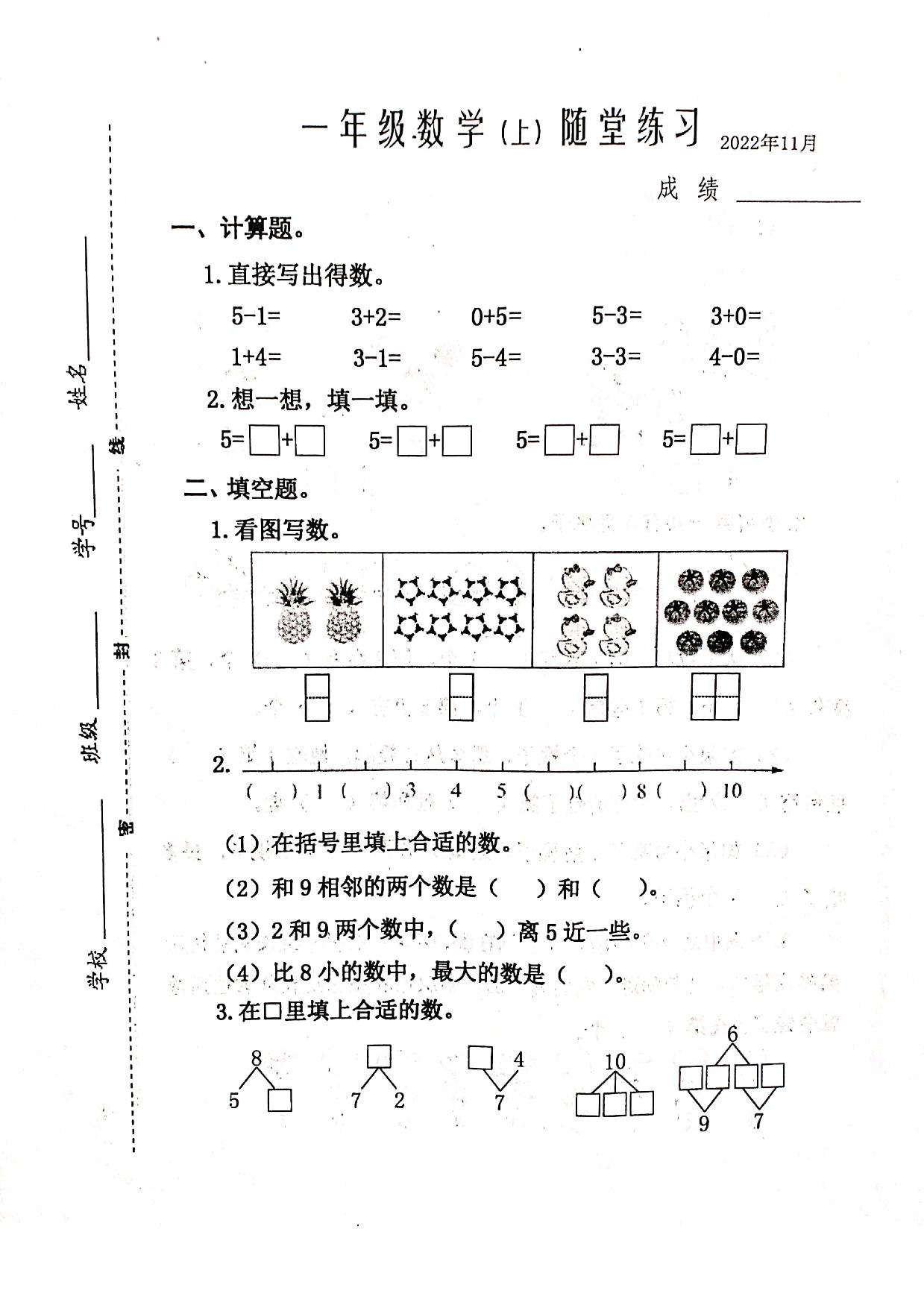 江苏省泰州市兴化市某校2022-2023学年第一学期期中试题一年级数学(苏教版)