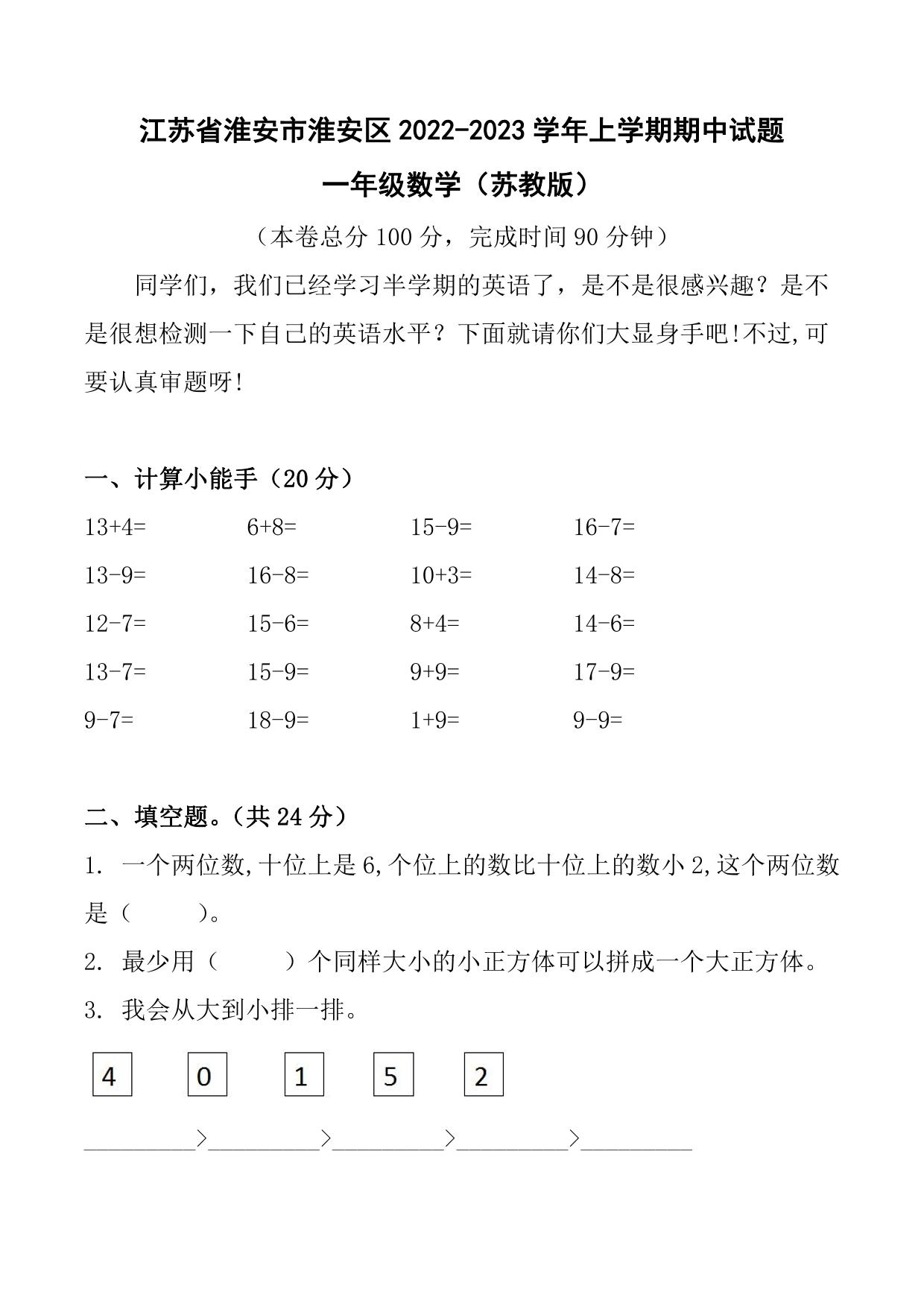 江苏省淮安市淮安区2022-2023学年上学期期中试题一年级数学(苏教版)