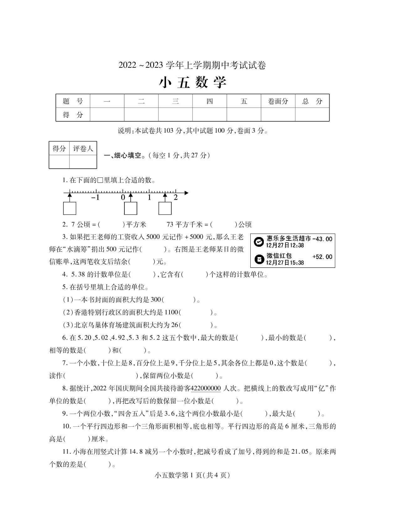 河南省平顶山市郏县2022-2023学年上学期期中试题五年级数学(苏教版)