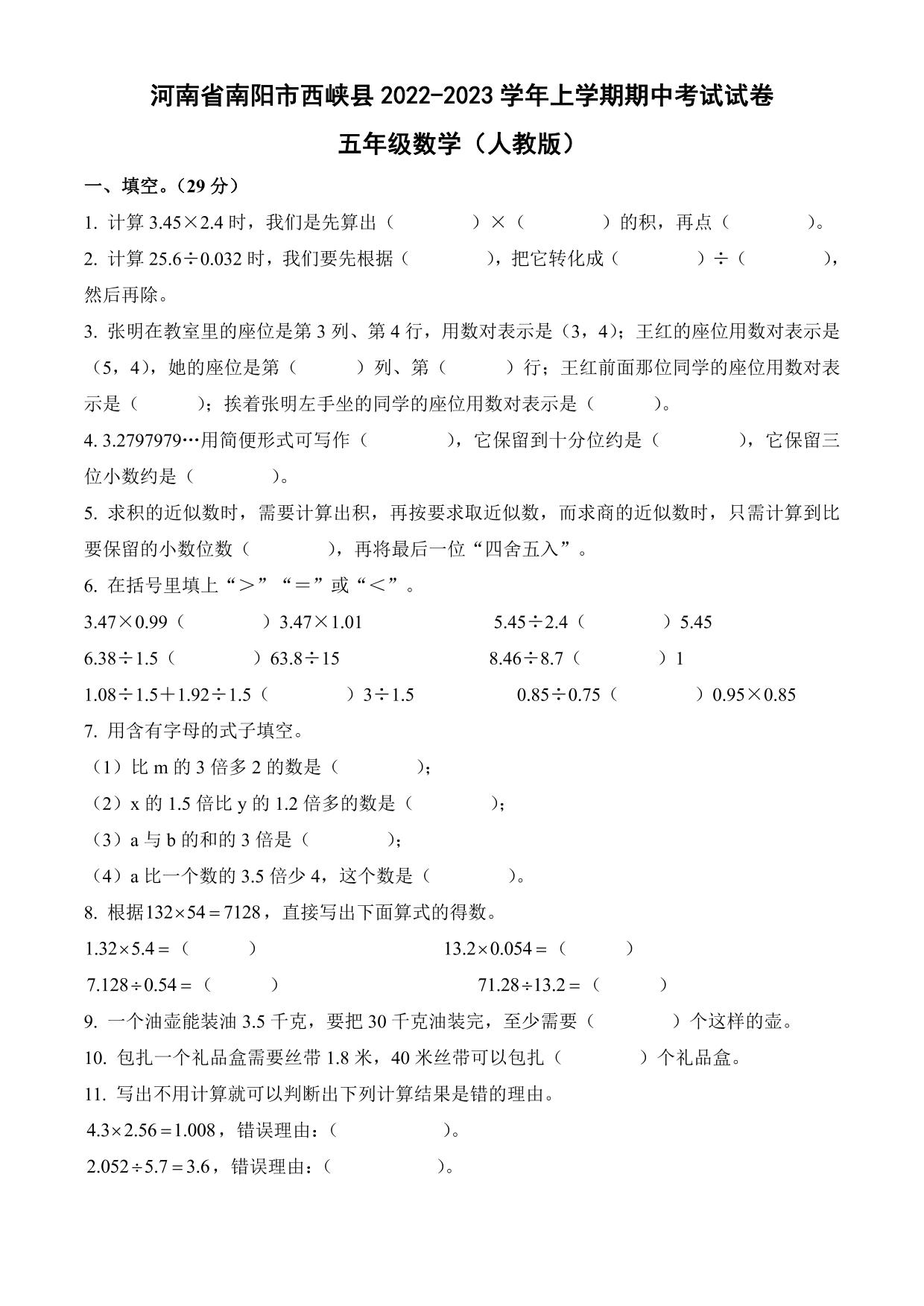 河南省南阳市西峡县2022-2023学年上学期期中考试试卷五年级数学(人教版)